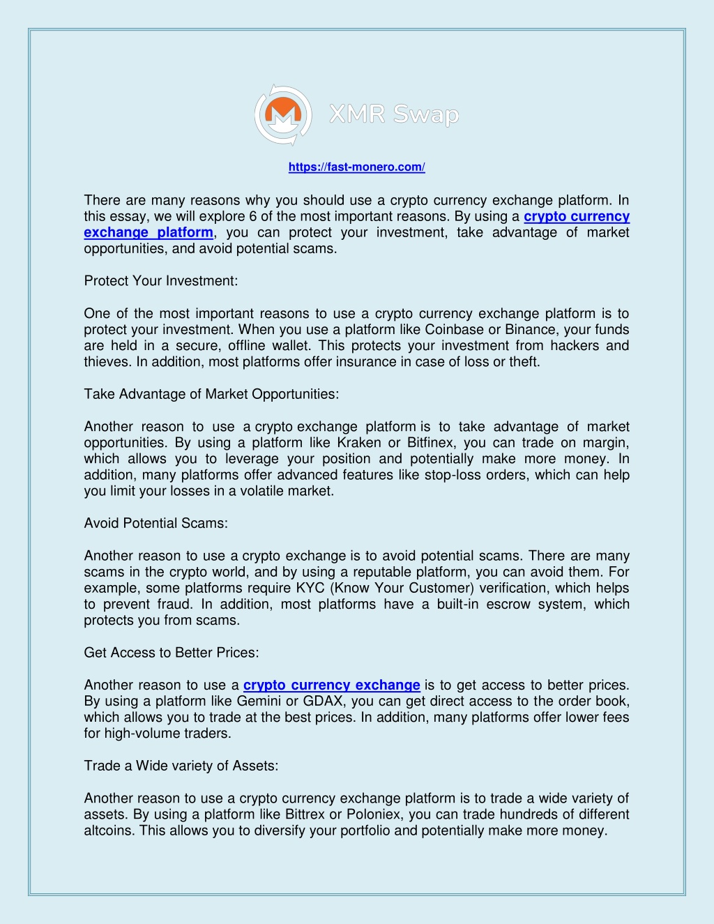 https://fast-monero.com/ There are many reasons why you should use a crypto currency exchange platform. In this essay, we will explore 6 of the most important reasons. By using a crypto currency exchange platform, you can protect your investment, take advantage of market opportunities, and avoid potential scams. Protect Your Investment: One of the most important reasons to use a crypto currency exchange platform is to protect your investment. When you use a platform like Coinbase or Binance, your funds are held in a secure, offline wallet. This protects your investment from hackers and thieves. In addition, most platforms offer insurance in case of loss or theft. Take Advantage of Market Opportunities: Another reason to use a cryptoexchange platform is to take advantage of market opportunities. By using a platform like Kraken or Bitfinex, you can trade on margin, which allows you to leverage your position and potentially make more money. In addition, many platforms offer advanced features like stop-loss orders, which can help you limit your losses in a volatile market. Avoid Potential Scams: Another reason to use a crypto exchange is to avoid potential scams. There are many scams in the crypto world, and by using a reputable platform, you can avoid them. For example, some platforms require KYC (Know Your Customer) verification, which helps to prevent fraud. In addition, most platforms have a built-in escrow system, which protects you from scams. Get Access to Better Prices: Another reason to use a crypto currency exchange is to get access to better prices. By using a platform like Gemini or GDAX, you can get direct access to the order book, which allows you to trade at the best prices. In addition, many platforms offer lower fees for high-volume traders. Trade a Wide variety of Assets: Another reason to use a crypto currency exchange platform is to trade a wide variety of assets. By using a platform like Bittrex or Poloniex, you can trade hundreds of different altcoins. This allows you to diversify your portfolio and potentially make more money.