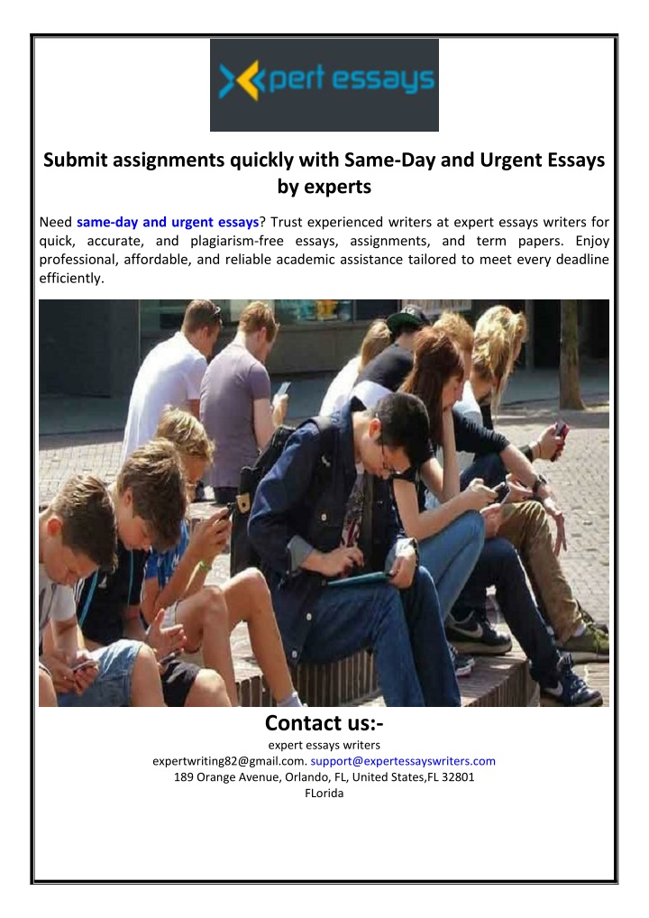 Submit assignments quickly with Same-Day and Urgent Essays by experts Need same-day and urgent essays? Trust experienced writers at expert essays writers for quick, accurate, and plagiarism-free essays, assignments, and term papers. Enjoy professional, affordable, and reliable academic assistance tailored to meet every deadline efficiently. Contact us:- expert essays writers expertwriting82@gmail.com. support@expertessayswriters.com 189 Orange Avenue, Orlando, FL, United States,FL 32801 FLorida