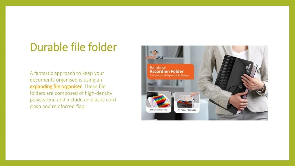 Durable file folder A fantastic approach to keep your documents organised is using an expanding file organiser. These file folders are composed of high-density polystyrene and include an elastic cord clasp and reinforced flap.