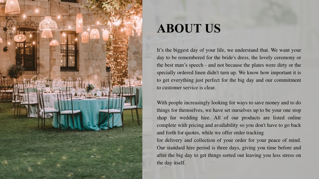 ABOUT US It’s the biggest day of your life, we understand that. We want your day to be remembered for the bride's dress, the lovely ceremony or the best man’s speech - and not because the plates were dirty or the specially ordered linen didn't turn up. We know how important it is to get everything just perfect for the big day and our commitment to customer service is clear. With people increasingly looking for ways to save money and to do things for themselves, we have set ourselves up to be your one stop shop for wedding hire. All of our products are listed online complete with pricing and availability so you don't have to go back and forth for quotes, while we offer order tracking for delivery and collection of your order for your peace of mind. Our standard hire period is three days, giving you time before and after the big day to get things sorted out leaving you less stress on the day itself.