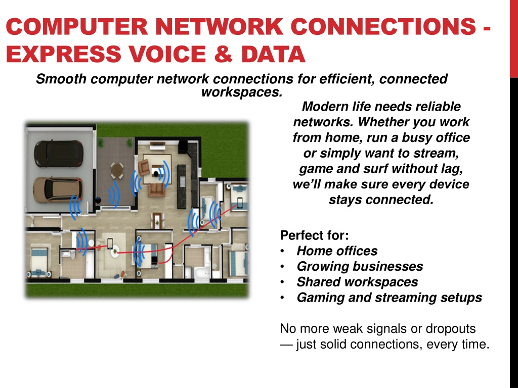 Computer Network Connections - Express Voice & Data Modern life needs reliable networks. Whether you work from home, run a busy office or simply want to stream, game and surf without lag, we’ll make sure every device stays connected. • Smooth computer network connections for efficient, connected workspaces. • Perfect for: • Home offices • Growing businesses • Shared workspaces • Gaming and streaming setups • No more weak signals or dropouts — just solid connections, every time.