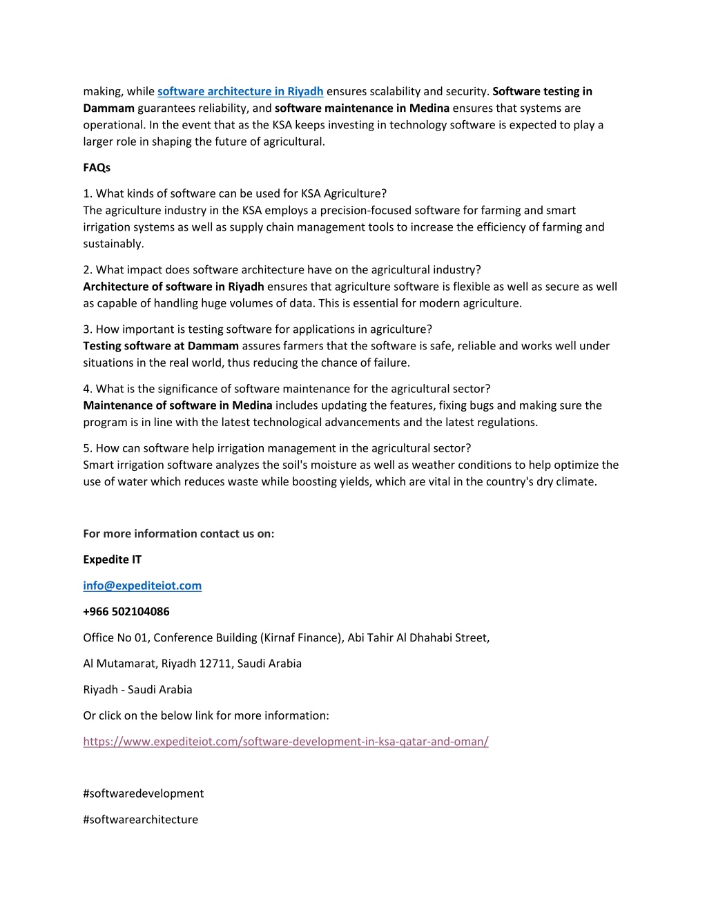 making, while software architecture in Riyadh ensures scalability and security. Software testing in Dammam guarantees reliability, and software maintenance in Medina ensures that systems are operational. In the event that as the KSA keeps investing in technology software is expected to play a larger role in shaping the future of agricultural. FAQs 1. What kinds of software can be used for KSA Agriculture? The agriculture industry in the KSA employs a precision-focused software for farming and smart irrigation systems as well as supply chain management tools to increase the efficiency of farming and sustainably. 2. What impact does software architecture have on the agricultural industry? Architecture of software in Riyadh ensures that agriculture software is flexible as well as secure as well as capable of handling huge volumes of data. This is essential for modern agriculture. 3. How important is testing software for applications in agriculture? Testing software at Dammam assures farmers that the software is safe, reliable and works well under situations in the real world, thus reducing the chance of failure. 4. What is the significance of software maintenance for the agricultural sector? Maintenance of software in Medina includes updating the features, fixing bugs and making sure the program is in line with the latest technological advancements and the latest regulations. 5. How can software help irrigation management in the agricultural sector? Smart irrigation software analyzes the soil's moisture as well as weather conditions to help optimize the use of water which reduces waste while boosting yields, which are vital in the country's dry climate. For more information contact us on: Expedite IT info@expediteiot.com +966 502104086 Office No 01, Conference Building (Kirnaf Finance), Abi Tahir Al Dhahabi Street, Al Mutamarat, Riyadh 12711, Saudi Arabia Riyadh - Saudi Arabia Or click on the below link for more information: https://www.expediteiot.com/software-development-in-ksa-qatar-and-oman/ #softwaredevelopment #softwarearchitecture