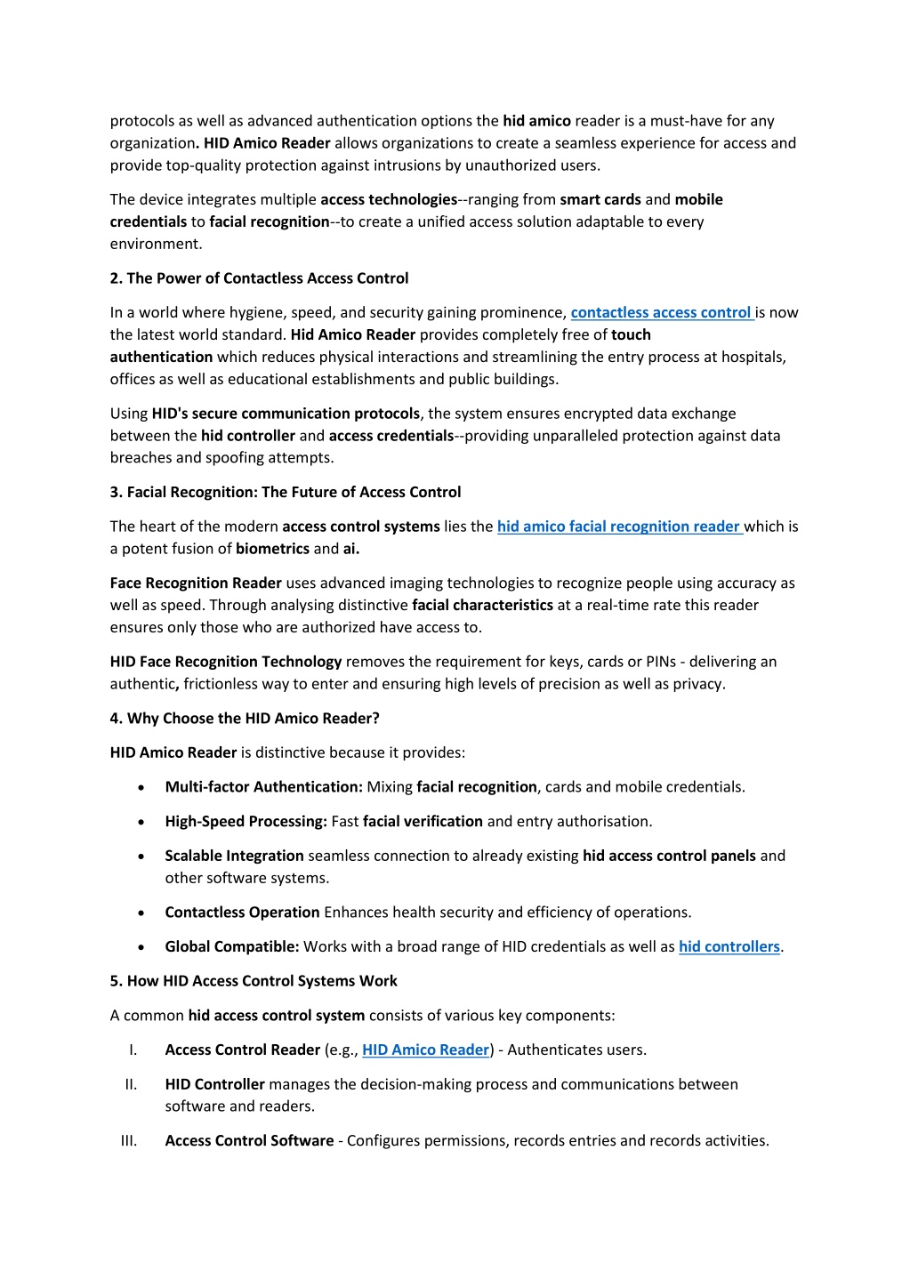 protocols as well as advanced authentication options the hid amico reader is a must-have for any organization. HID Amico Reader allows organizations to create a seamless experience for access and provide top-quality protection against intrusions by unauthorized users. The device integrates multiple access technologies--ranging from smart cards and mobile credentials to facial recognition--to create a unified access solution adaptable to every environment. 2. The Power of Contactless Access Control In a world where hygiene, speed, and security gaining prominence, contactless access control is now the latest world standard. Hid Amico Reader provides completely free of touch authentication which reduces physical interactions and streamlining the entry process at hospitals, offices as well as educational establishments and public buildings. Using HID's secure communication protocols, the system ensures encrypted data exchange between the hid controller and access credentials--providing unparalleled protection against data breaches and spoofing attempts. 3. Facial Recognition: The Future of Access Control The heart of the modern access control systems lies the hid amico facial recognition reader which is a potent fusion of biometrics and ai. Face Recognition Reader uses advanced imaging technologies to recognize people using accuracy as well as speed. Through analysing distinctive facial characteristics at a real-time rate this reader ensures only those who are authorized have access to. HID Face Recognition Technology removes the requirement for keys, cards or PINs - delivering an authentic, frictionless way to enter and ensuring high levels of precision as well as privacy. 4. Why Choose the HID Amico Reader? HID Amico Reader is distinctive because it provides: • Multi-factor Authentication: Mixing facial recognition, cards and mobile credentials. • High-Speed Processing: Fast facial verification and entry authorisation. • Scalable Integration seamless connection to already existing hid access control panels and other software systems. • Contactless Operation Enhances health security and efficiency of operations. • Global Compatible: Works with a broad range of HID credentials as well as hid controllers. 5. How HID Access Control Systems Work A common hid access control system consists of various key components: I. Access Control Reader (e.g., HID Amico Reader) - Authenticates users. II. HID Controller manages the decision-making process and communications between software and readers. III. Access Control Software - Configures permissions, records entries and records activities.