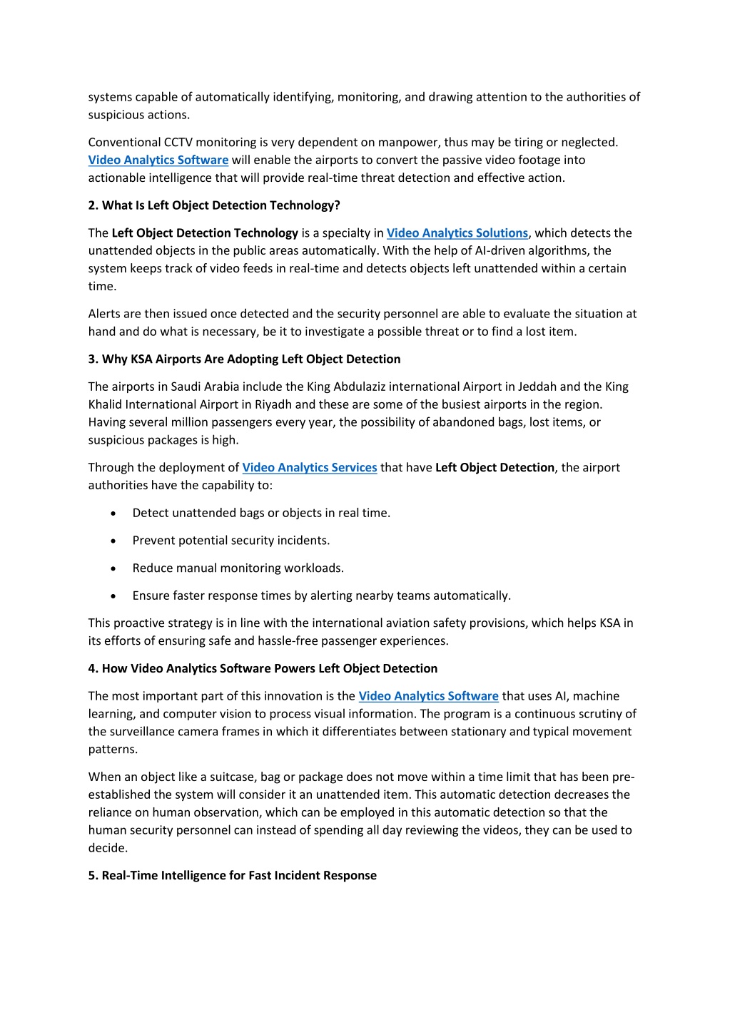 systems capable of automatically identifying, monitoring, and drawing attention to the authorities of suspicious actions. Conventional CCTV monitoring is very dependent on manpower, thus may be tiring or neglected. Video Analytics Software will enable the airports to convert the passive video footage into actionable intelligence that will provide real-time threat detection and effective action. 2. What Is Left Object Detection Technology? The Left Object DetectionTechnology is a specialty in Video Analytics Solutions, which detects the unattended objects in the public areas automatically. With the help of AI-driven algorithms, the system keeps track of video feeds in real-time and detects objects left unattended within a certain time. Alerts are then issued once detected and the security personnel are able to evaluate the situation at hand and do what is necessary, be it to investigate a possible threat or to find a lost item. 3. Why KSA Airports Are Adopting Left Object Detection The airports in Saudi Arabia include the King Abdulaziz international Airport in Jeddah and the King Khalid International Airport in Riyadh and these are some of the busiest airports in the region. Having several million passengers every year, the possibility of abandoned bags, lost items, or suspicious packages is high. Through the deployment of Video Analytics Services that have Left Object Detection, the airport authorities have the capability to: • Detect unattended bags or objects in real time. • Prevent potential security incidents. • Reduce manual monitoring workloads. • Ensure faster response times by alerting nearby teams automatically. This proactive strategy is in line with the international aviation safety provisions, which helps KSA in its efforts of ensuring safe and hassle-free passenger experiences. 4. How Video Analytics Software Powers Left Object Detection The most important part of this innovation is the Video Analytics Software that uses AI, machine learning, and computer vision to process visual information. The program is a continuous scrutiny of the surveillance camera frames in which it differentiates between stationary and typical movement patterns. When an object like a suitcase, bag or package does not move within a time limit that has been pre- established the system will consider it an unattended item. This automatic detection decreases the reliance on human observation, which can be employed in this automatic detection so that the human security personnel can instead of spending all day reviewing the videos, they can be used to decide. 5. Real-Time Intelligence for Fast Incident Response