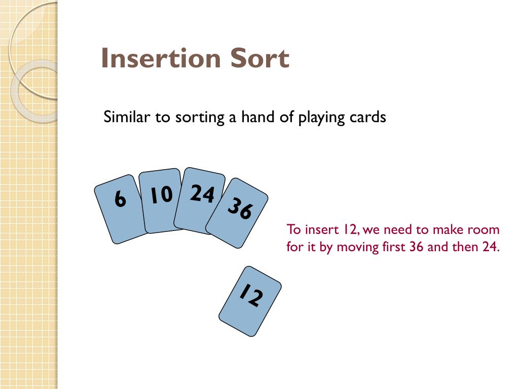 24 10 6 Insertion Sort Similar to sorting a hand of playing cards 36 To insert 12, we need to make room for it by moving first 36 and then 24. 12
