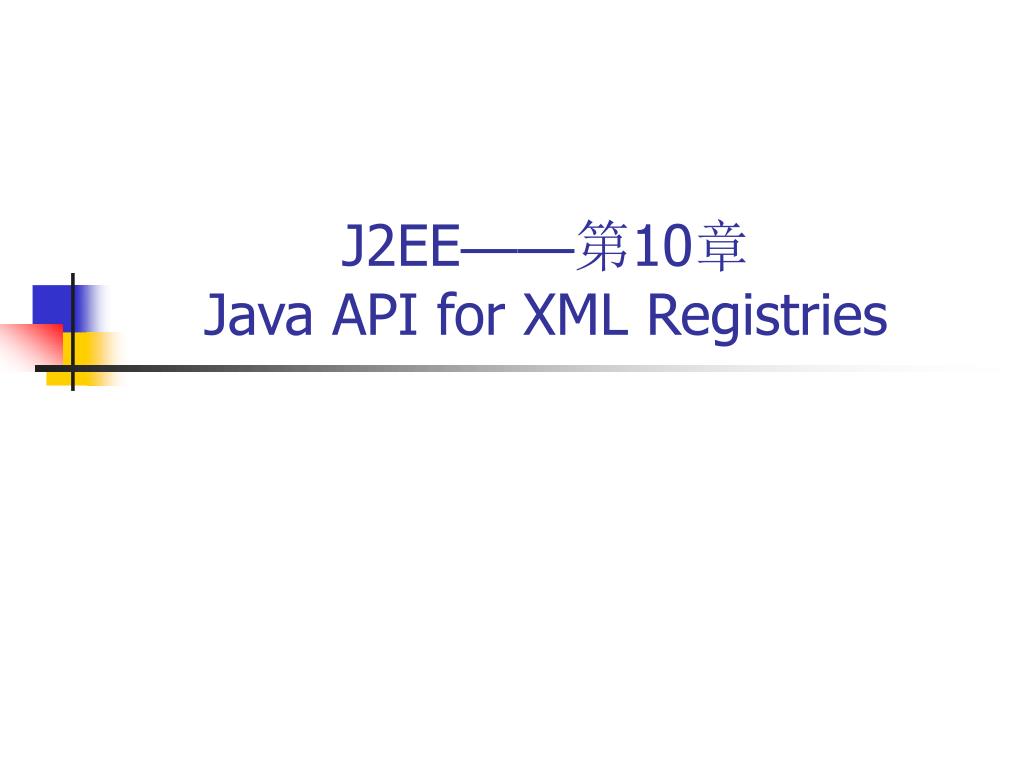 J2EE —— 第 10 章 Java API for XML Registries. JAXR 概述. XML Registries 用于构建、部署、发现 Web 服务 (ebXML,UDDI) JAXR 体系结构. 实现 JAXR 客户端. 查找连接工厂 import javax.xml.registry.*; import javax.naming.*; ... Context context = new InitialContext();