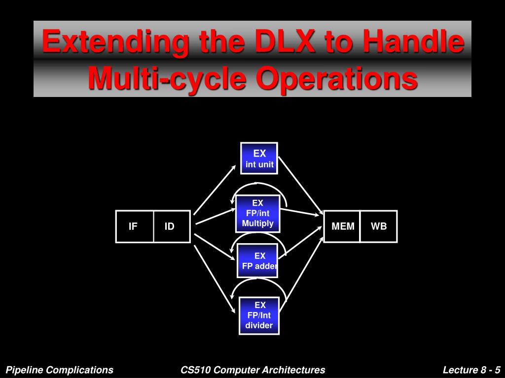 EX intunit IF ID IF ID EX FP/int Multiply EX MEM WB MEM WB EX FP adder EX FP/Int divider Extending the DLX to Handle Multi-cycle Operations CS510 Computer Architectures