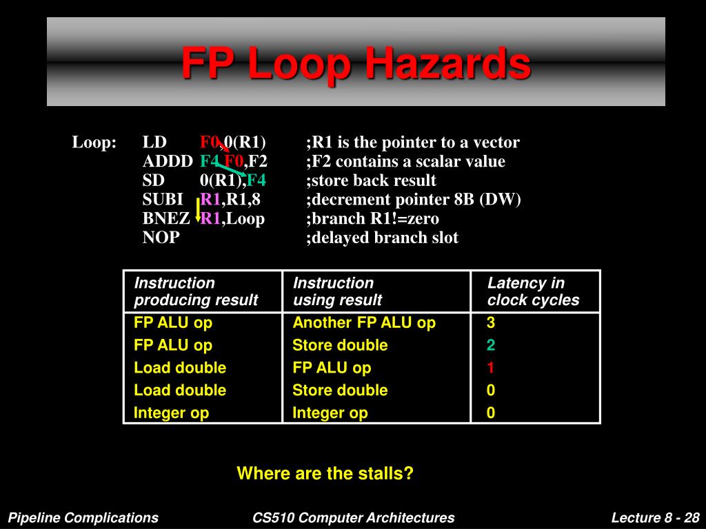 Instruction Instruction Latency inproducing result using result clock cycles FP ALU op Another FP ALU op 3 FP ALU op Store double2 Load double FP ALU op1 Load double Store double 0 Integer op Integer op 0 FP Loop Hazards Loop: LD F0,0(R1) ;R1 is the pointer to a vector ADDD F4,F0,F2 ;F2 contains a scalar value SD 0(R1),F4 ;store back result SUBI R1,R1,8 ;decrement pointer 8B (DW) BNEZ R1,Loop ;branch R1!=zero NOP ;delayed branch slot Where are the stalls? CS510 Computer Architectures