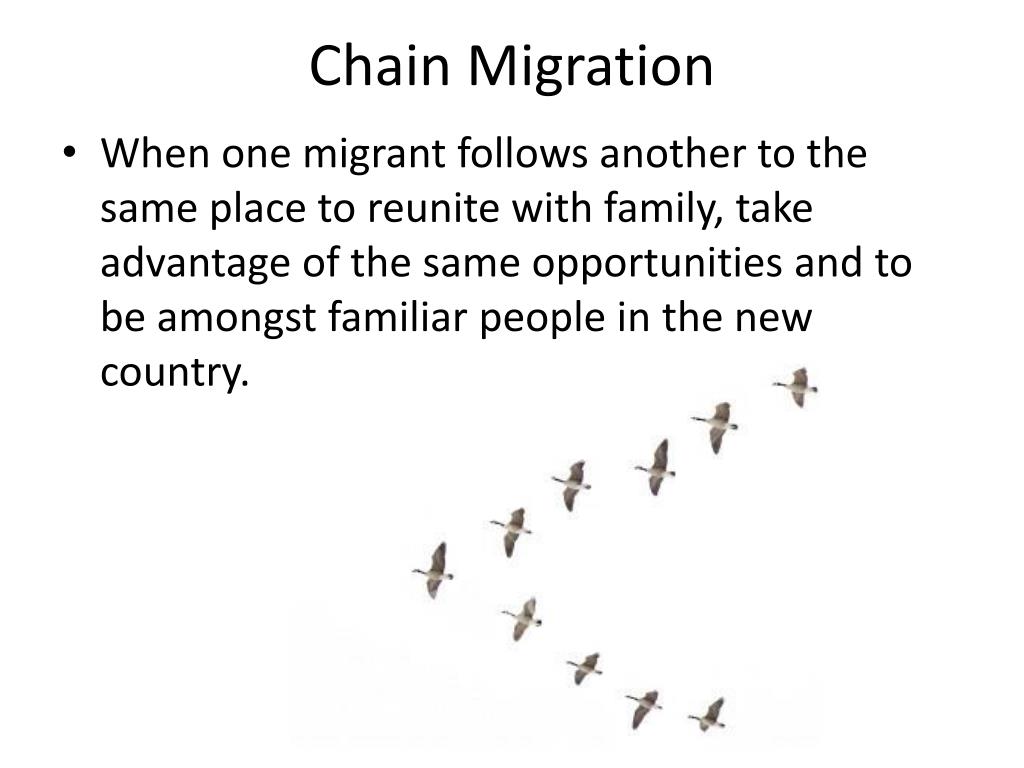 Chain Migration • When one migrant follows another to the same place to reunite with family, take advantage of the same opportunities and to be amongst familiar people in the new country.