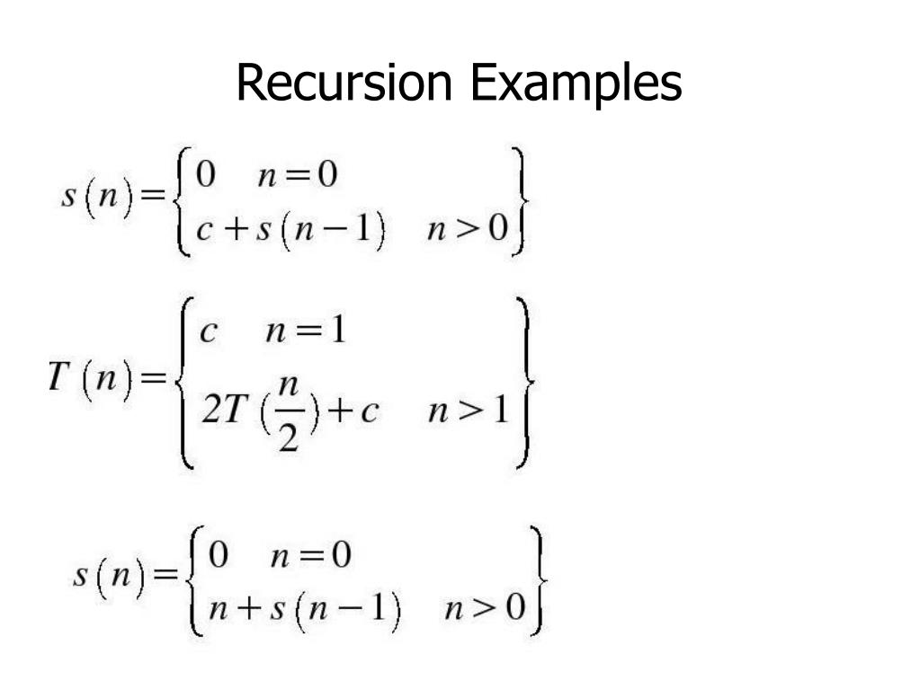 Recurrences • The expression:is a recurrence. • It says that the function T(n) is equal to 2*T(n/2) + cn if n is • greater than 1. If n = 1, then T(n) = c only • What is happening here is that the input size (n) is being • cut in half each time. Thus, we will eventually get to the • point where n is equal to 1. Then we know to stop