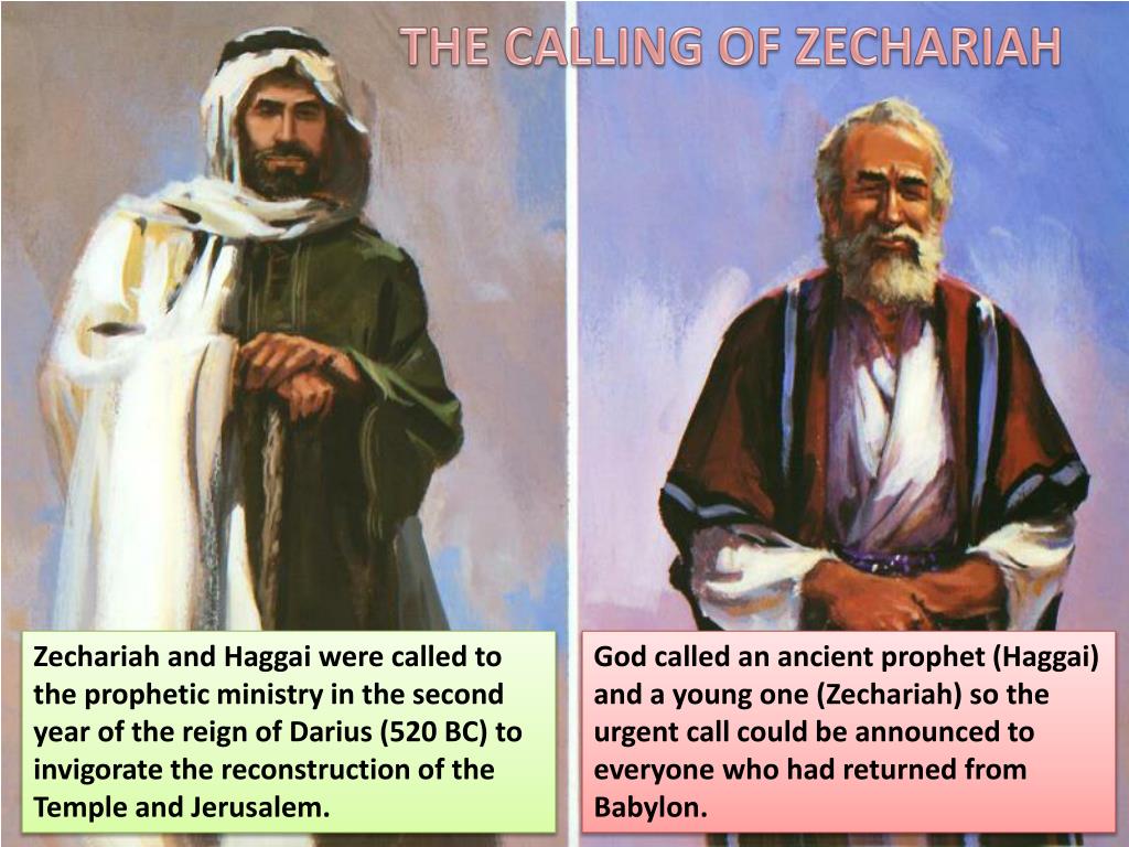 THECALLING OF ZECHARIAH Zechariah and Haggai were called to the prophetic ministry in the second year of the reign of Darius (520 BC) to invigorate the reconstruction of the Temple and Jerusalem. God called an ancient prophet (Haggai) and a young one (Zechariah) so the urgent call could be announced to everyone who had returned from Babylon.