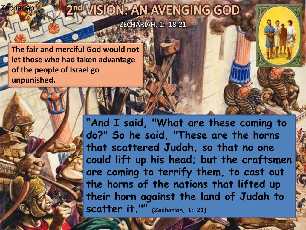 Zechariah Zechariah 2nd VISION: AN AVENGING GOD ZECHARIAH, 1: 18-21 The fair and merciful God would not let those who had taken advantage of the people of Israel go unpunished. “And I said, "What are these coming to do?" So he said, "These are the horns that scattered Judah, so that no one could lift up his head; but the craftsmen are coming to terrify them, to cast out the horns of the nations that lifted up their horn against the land of Judah to scatter it."” (Zechariah, 1: 21)