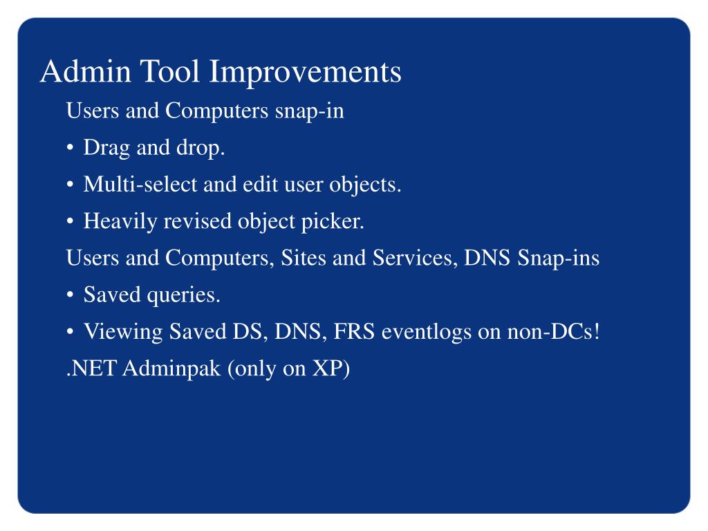 Admin Tool Improvements • Users and Computers snap-in • Drag and drop. • Multi-select and edit user objects. • Heavily revised object picker. • Users and Computers, Sites and Services, DNS Snap-ins • Saved queries. • Viewing Saved DS, DNS, FRS eventlogs on non-DCs! • .NET Adminpak (only on XP)