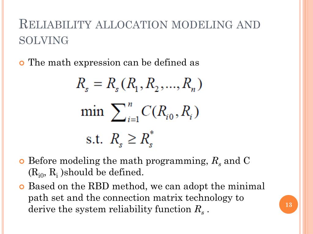 Reliability allocation modeling and solving • The math expression can be defined as • Before modeling the math programming, Rsand C (Ri0, Ri )should be defined. • Based on the RBD method, we can adopt the minimal path setand the connection matrix technology toderive the system reliability function Rs.