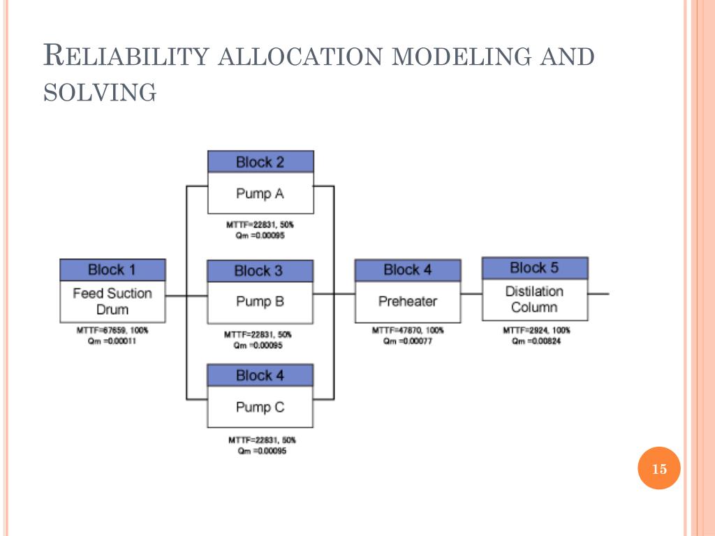Reliability allocation modeling and solving • A Reliability Block Diagram (RBD) performs the system reliability and availability analyses on large and complex systems using block diagrams to show network relationships. • The structure of the reliability block diagram defines the logical interaction of failures within a system that are required to sustain system operation. • http://www.reliabilityeducation.com/rbd.pdf