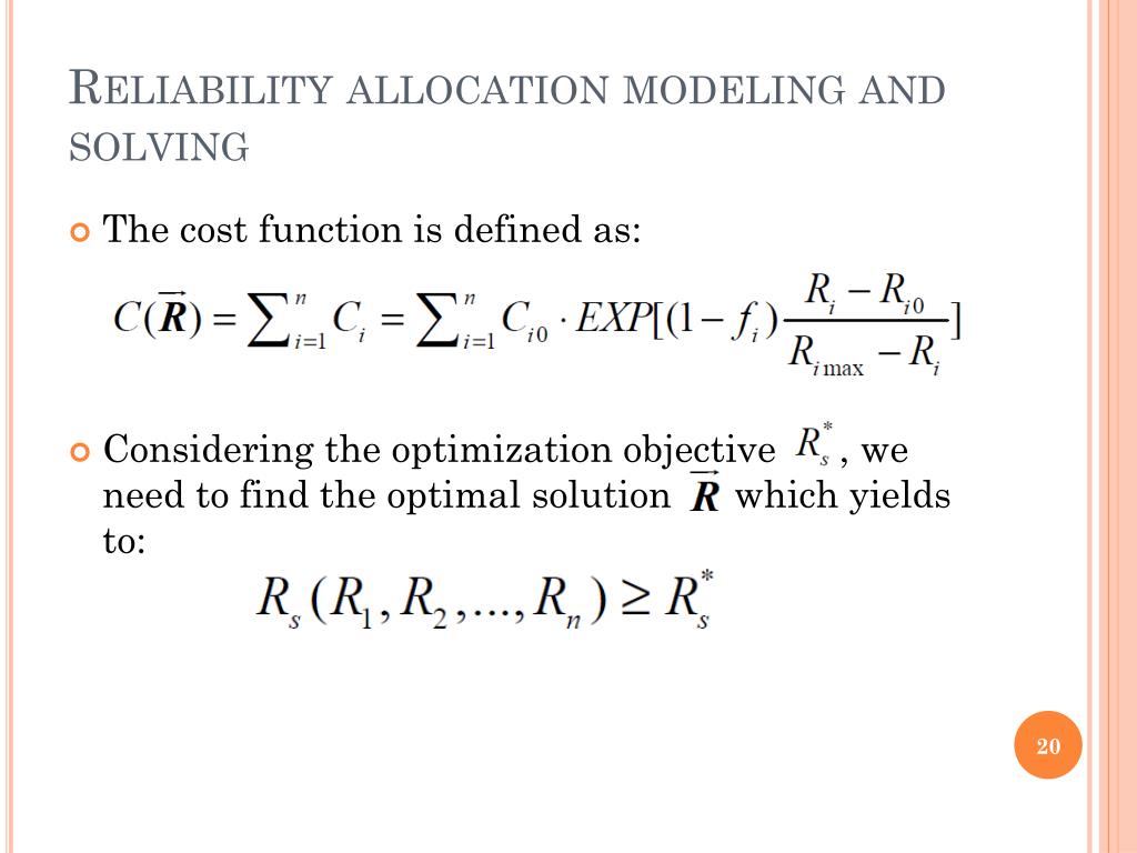 Reliability allocation modeling and solving • The cost function is defined as: • Considering the optimization objective , we need to find the optimal solution which yields to: