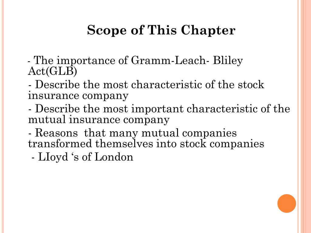 Scope of This Chapter - The importance of Gramm-Leach- Bliley Act(GLB) - Describe the most characteristic of the stock insurance company - Describe the most important characteristic of the mutual insurance company - Reasons that many mutual companies transformed themselves into stock companies - LIoyd ‘s of London