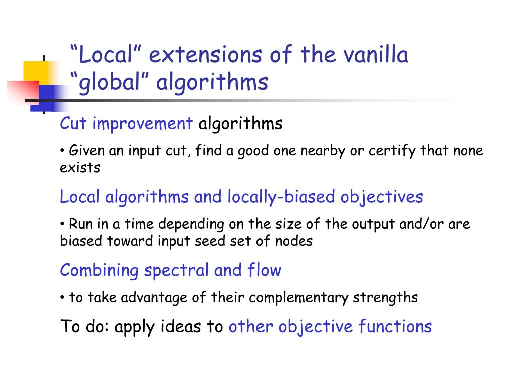 “Local” extensions of the vanilla “global” algorithms Cut improvement algorithms • Given an input cut, find a good one nearby or certify that none exists Local algorithms and locally-biased objectives • Run in a time depending on the size of the output and/or are biased toward input seed set of nodes Combining spectral and flow • to take advantage of their complementary strengths To do: apply ideas to other objective functions
