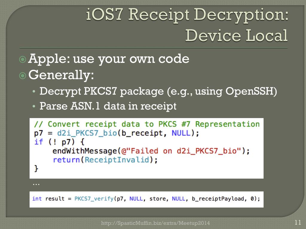 iOS7 Receipt Decryption: Device Local … • Apple: use your own code • Generally: • Decrypt PKCS7 package (e.g., using OpenSSH) • Parse ASN.1 data in receipt http://SpasticMuffin.biz/extra/Meetup2014