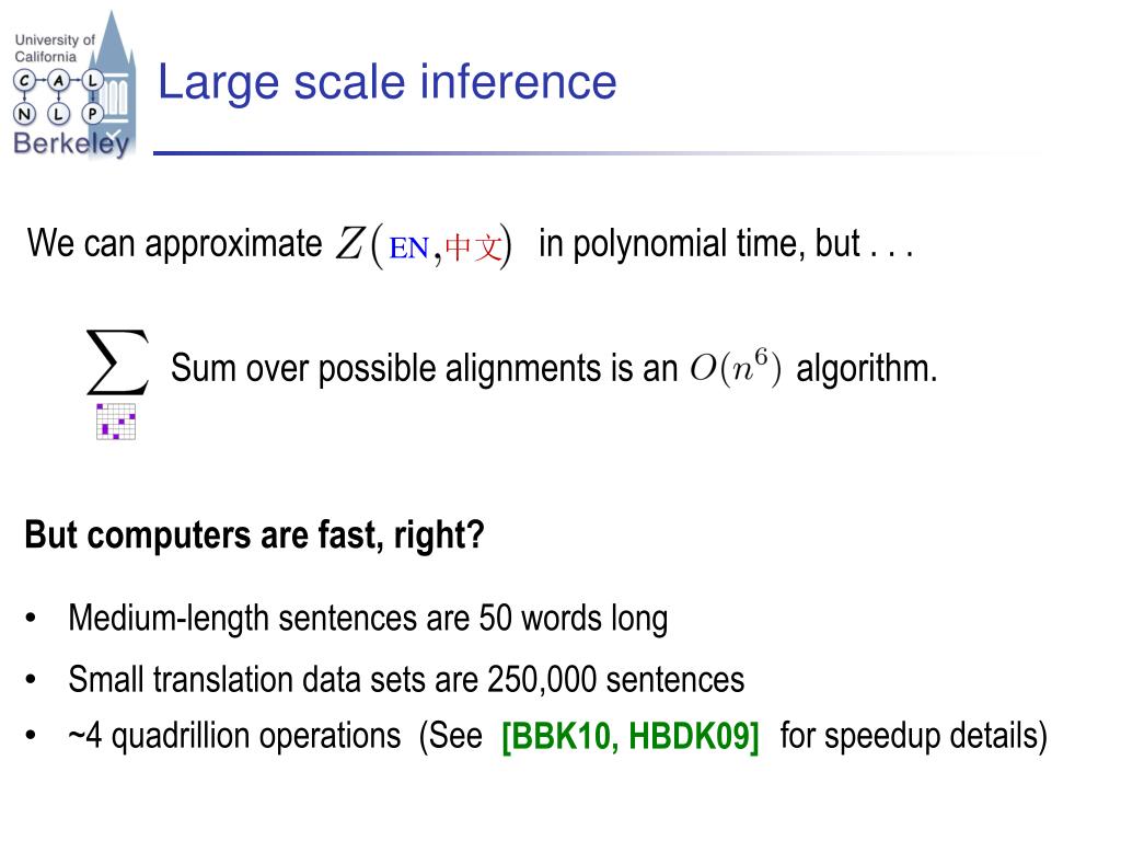 Large scale inference We can approximate in polynomial time, but . . . EN 中文 Sum over possible alignments is an algorithm. • But computers are fast, right? • Medium-length sentences are 50 words long • Small translation data sets are 250,000 sentences • ~4 quadrillion operations (See for speedup details) [BBK10, HBDK09]
