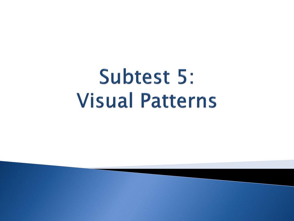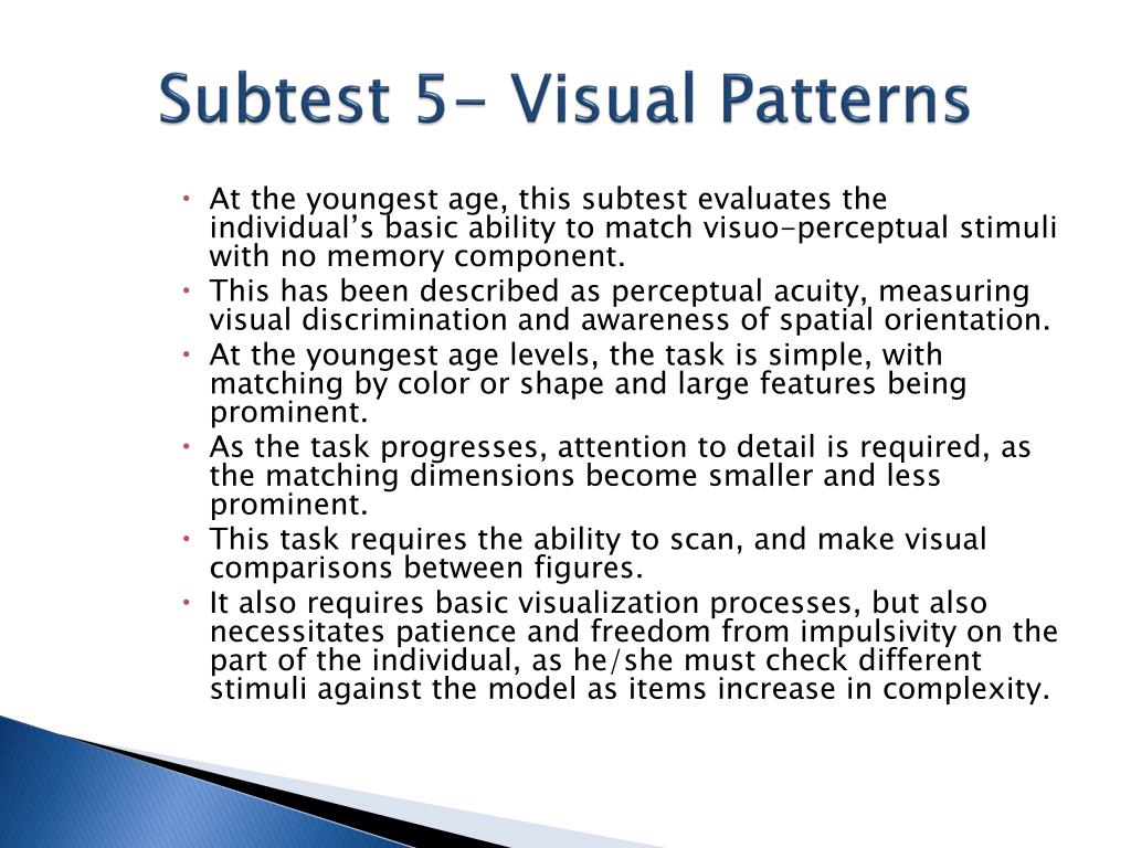 Subtest 5- Visual Patterns • At the youngest age, this subtest evaluates the individual’s basic ability to match visuo-perceptual stimuli with no memory component. • This has been described as perceptual acuity, measuring visual discrimination and awareness of spatial orientation. • At the youngest age levels, the task is simple, with matching by color or shape and large features being prominent. • As the task progresses, attention to detail is required, as the matching dimensions become smaller and less prominent. • This task requires the ability to scan, and make visual comparisons between figures. • It also requires basic visualization processes, but also necessitates patience and freedom from impulsivity on the part of the individual, as he/she must check different stimuli against the model as items increase in complexity.