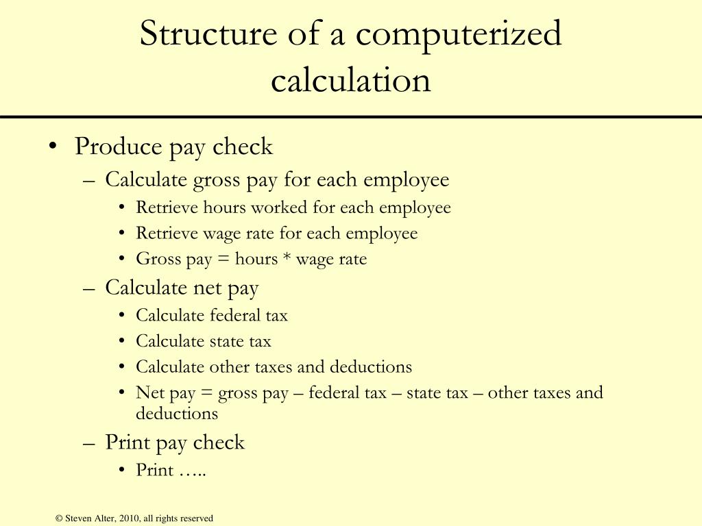 Structure of a computerized calculation • Produce pay check • Calculate gross pay for each employee • Retrieve hours worked for each employee • Retrieve wage rate for each employee • Gross pay = hours * wage rate • Calculate net pay • Calculate federal tax • Calculate state tax • Calculate other taxes and deductions • Net pay = gross pay – federal tax – state tax – other taxes and deductions • Print pay check • Print …..