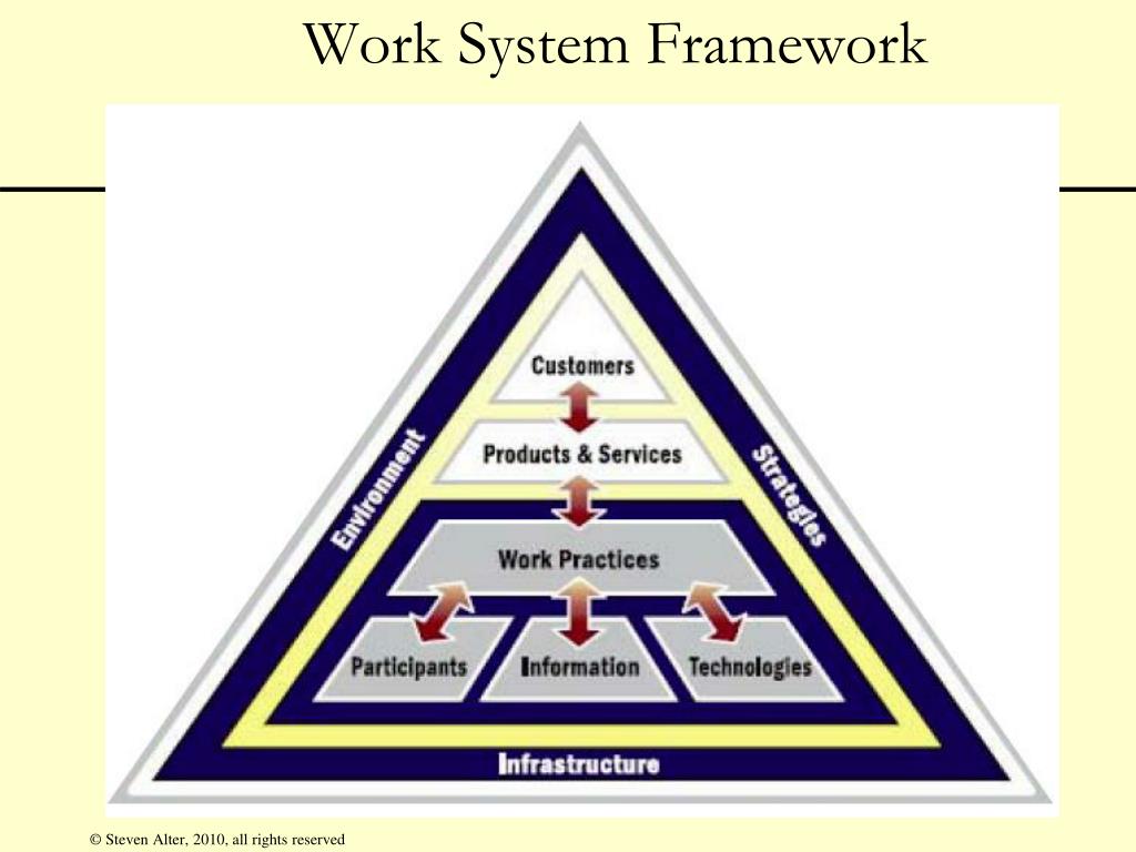 The Work System Method: Connecting People, Processes, and IT for Business Results • The big picture for understanding systems in organizations • Drill down into work system elements • Lots of business terms for understanding and analyzing systems