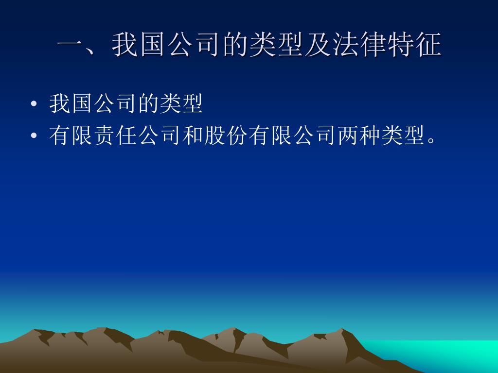 一、我国公司的类型及法律特征 • 我国公司的类型 • 有限责任公司和股份有限公司两种类型。