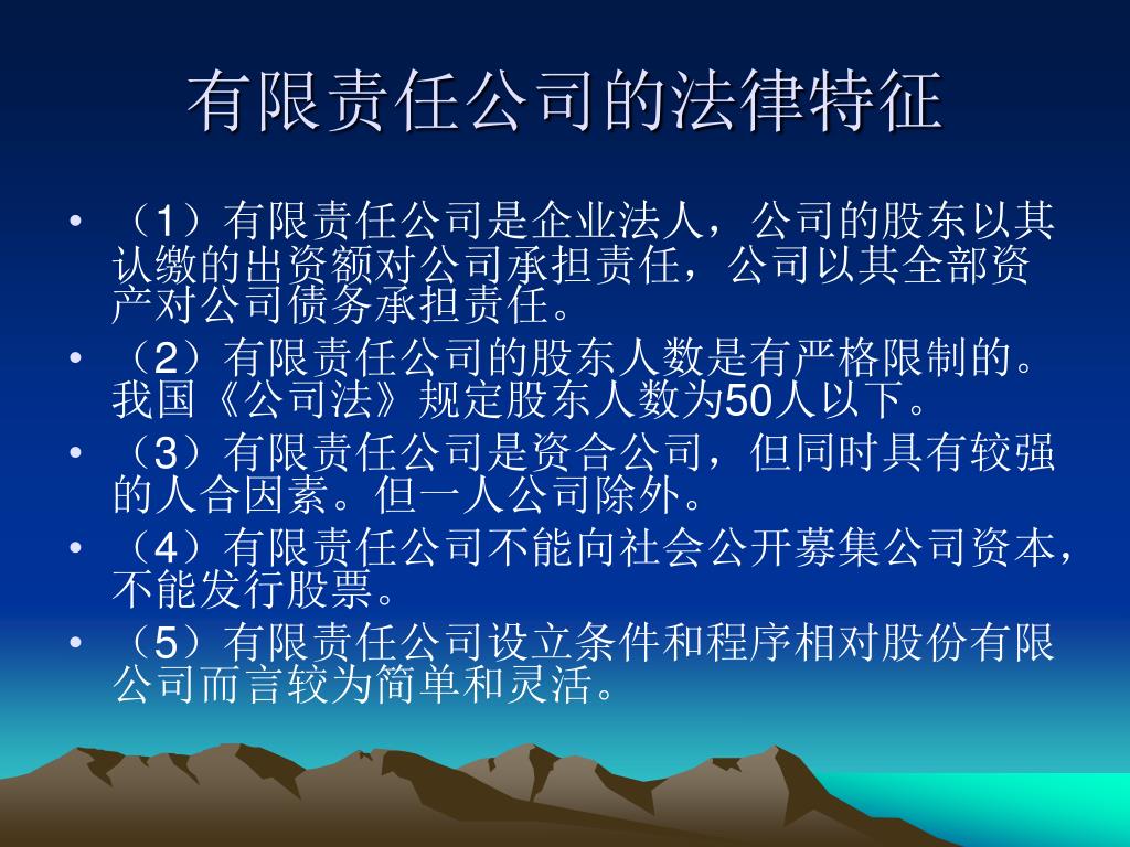 有限责任公司的法律特征 • (1)有限责任公司是企业法人,公司的股东以其认缴的出资额对公司承担责任,公司以其全部资产对公司债务承担责任。 • (2)有限责任公司的股东人数是有严格限制的。我国《公司法》规定股东人数为50人以下。 • (3)有限责任公司是资合公司,但同时具有较强的人合因素。但一人公司除外。 • (4)有限责任公司不能向社会公开募集公司资本,不能发行股票。 • (5)有限责任公司设立条件和程序相对股份有限公司而言较为简单和灵活。