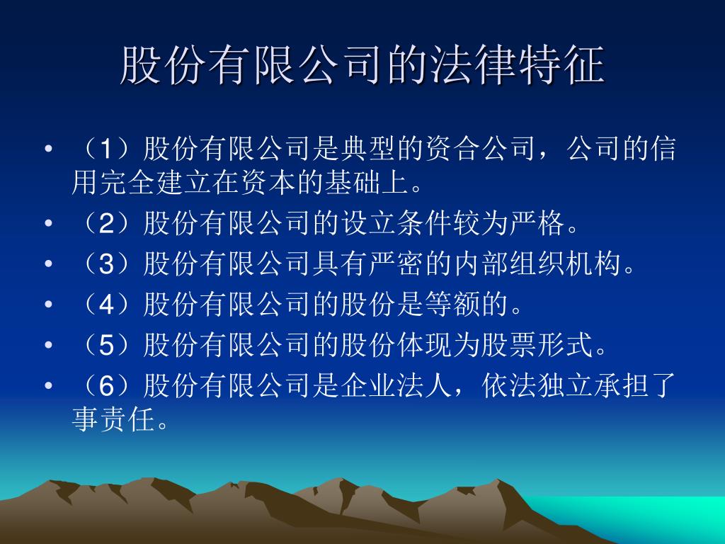 股份有限公司的法律特征 • (1)股份有限公司是典型的资合公司,公司的信用完全建立在资本的基础上。 • (2)股份有限公司的设立条件较为严格。 • (3)股份有限公司具有严密的内部组织机构。 • (4)股份有限公司的股份是等额的。 • (5)股份有限公司的股份体现为股票形式。 • (6)股份有限公司是企业法人,依法独立承担了事责任。