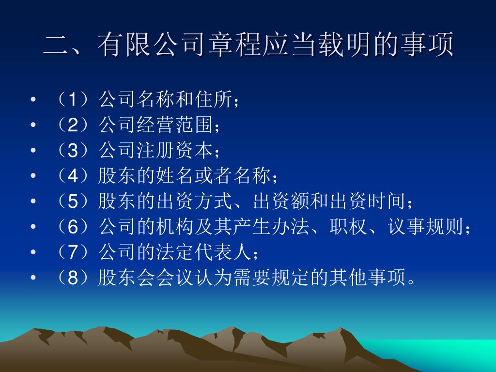 二、有限公司章程应当载明的事项 • (1)公司名称和住所; • (2)公司经营范围; • (3)公司注册资本; • (4)股东的姓名或者名称; • (5)股东的出资方式、出资额和出资时间; • (6)公司的机构及其产生办法、职权、议事规则; • (7)公司的法定代表人; • (8)股东会会议认为需要规定的其他事项。
