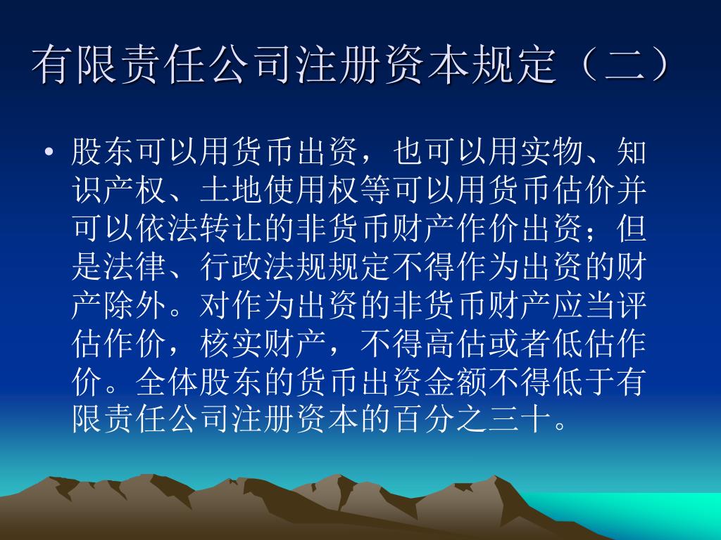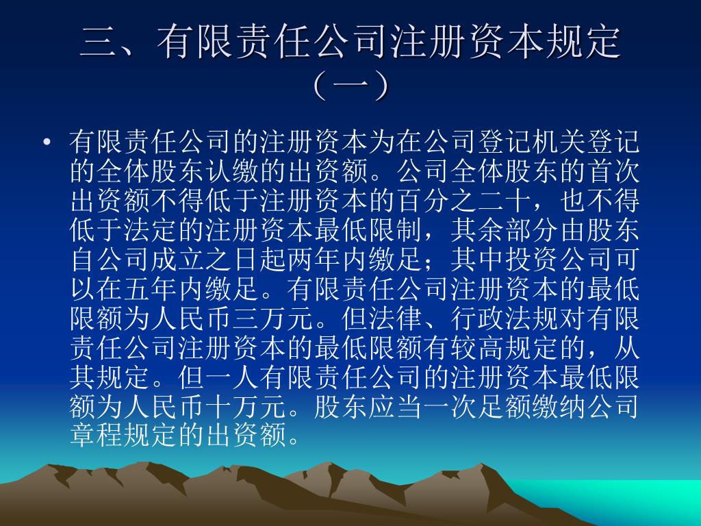 三、有限责任公司注册资本规定(一) • 有限责任公司的注册资本为在公司登记机关登记的全体股东认缴的出资额。公司全体股东的首次出资额不得低于注册资本的百分之二十,也不得低于法定的注册资本最低限制,其余部分由股东自公司成立之日起两年内缴足;其中投资公司可以在五年内缴足。有限责任公司注册资本的最低限额为人民币三万元。但法律、行政法规对有限责任公司注册资本的最低限额有较高规定的,从其规定。但一人有限责任公司的注册资本最低限额为人民币十万元。股东应当一次足额缴纳公司章程规定的出资额。