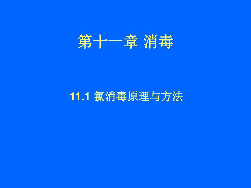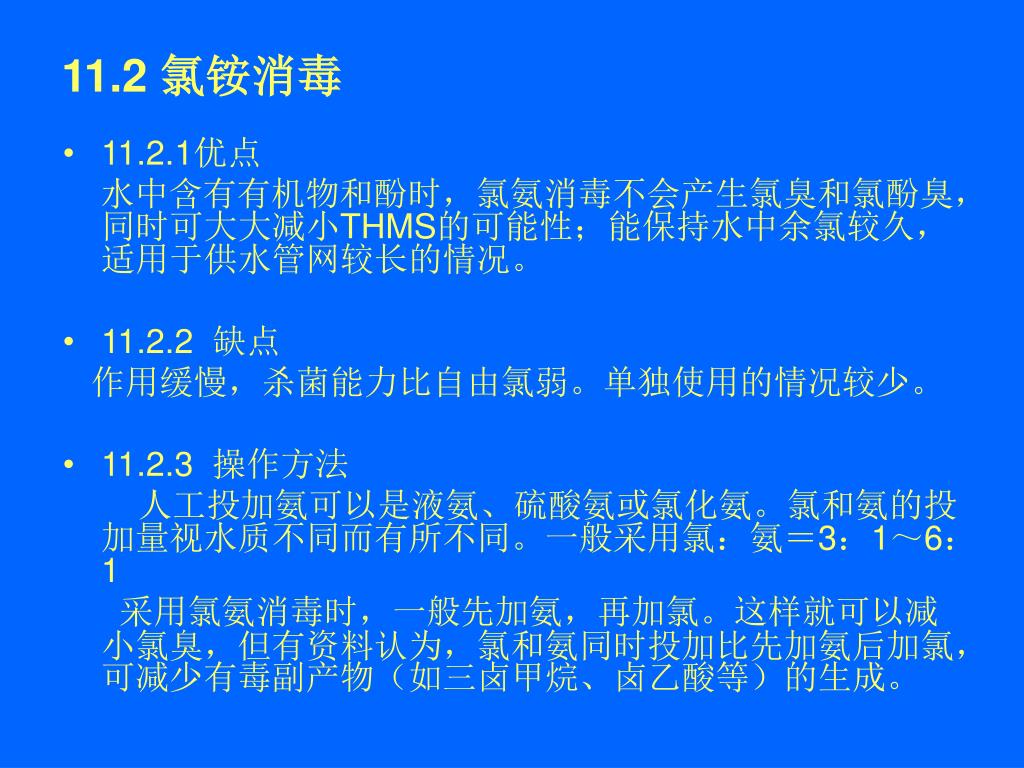 11.2 氯铵消毒 • 11.2.1优点 水中含有有机物和酚时,氯氨消毒不会产生氯臭和氯酚臭,同时可大大减小THMS的可能性;能保持水中余氯较久,适用于供水管网较长的情况。 • 11.2.2 缺点 作用缓慢,杀菌能力比自由氯弱。单独使用的情况较少。 • 11.2.3 操作方法 人工投加氨可以是液氨、硫酸氨或氯化氨。氯和氨的投加量视水质不同而有所不同。一般采用氯:氨=3:1~6:1 采用氯氨消毒时,一般先加氨,再加氯。这样就可以减小氯臭,但有资料认为,氯和氨同时投加比先加氨后加氯,可减少有毒副产物(如三卤甲烷、卤乙酸等)的生成。