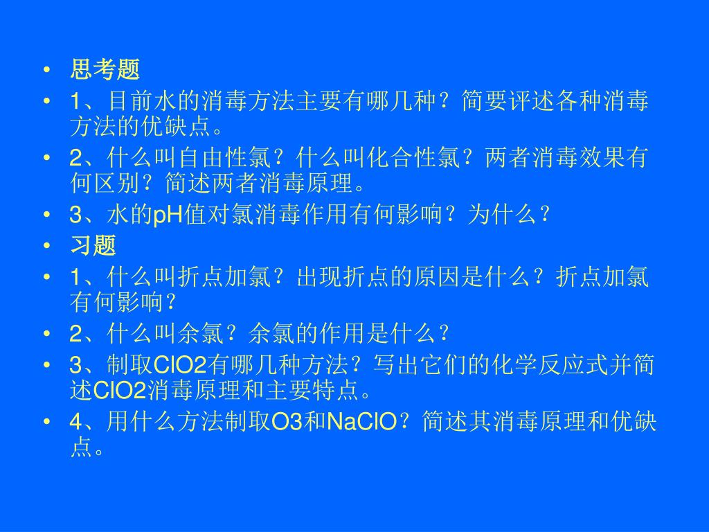 思考题 • 1、目前水的消毒方法主要有哪几种?简要评述各种消毒方法的优缺点。 • 2、什么叫自由性氯?什么叫化合性氯?两者消毒效果有何区别?简述两者消毒原理。 • 3、水的pH值对氯消毒作用有何影响?为什么? • 习题 • 1、什么叫折点加氯?出现折点的原因是什么?折点加氯有何影响? • 2、什么叫余氯?余氯的作用是什么? • 3、制取ClO2有哪几种方法?写出它们的化学反应式并简述ClO2消毒原理和主要特点。 • 4、用什么方法制取O3和NaClO?简述其消毒原理和优缺点。