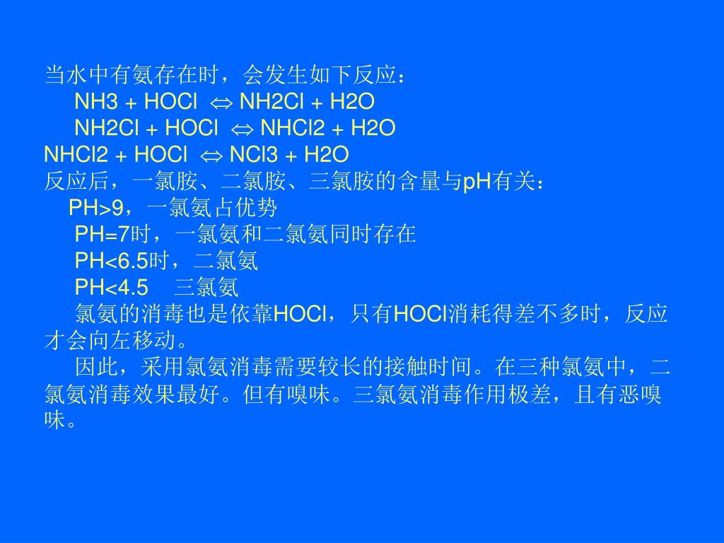 当水中有氨存在时,会发生如下反应:NH3 + HOCl NH2Cl + H2O NH2Cl + HOCl NHCl2 + H2ONHCl2 + HOCl NCl3 + H2O反应后,一氯胺、二氯胺、三氯胺的含量与pH有关:PH>9,一氯氨占优势PH=7时,一氯氨和二氯氨同时存在PH<6.5时,二氯氨PH<4.5 三氯氨 氯氨的消毒也是依靠HOCl,只有HOCl消耗得差不多时,反应才会向左移动。 因此,采用氯氨消毒需要较长的接触时间。在三种氯氨中,二氯氨消毒效果最好。但有嗅味。三氯氨消毒作用极差,且有恶嗅味。