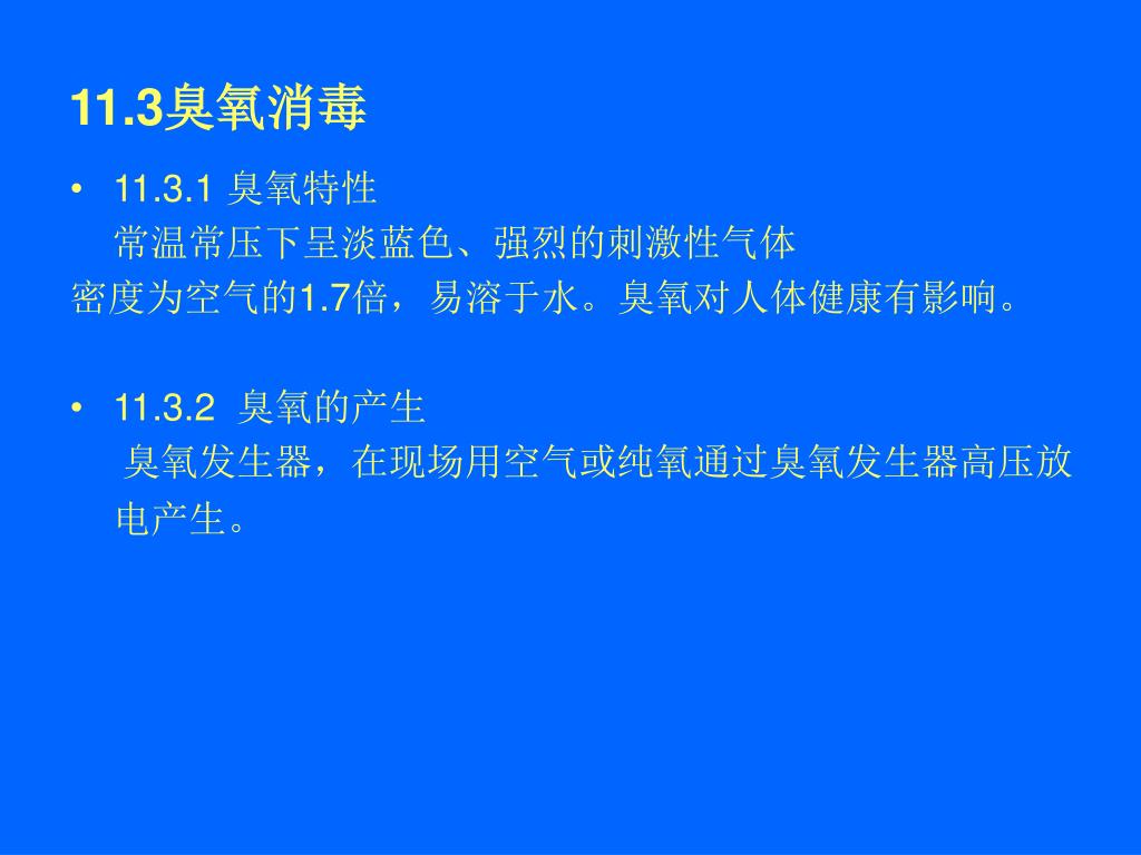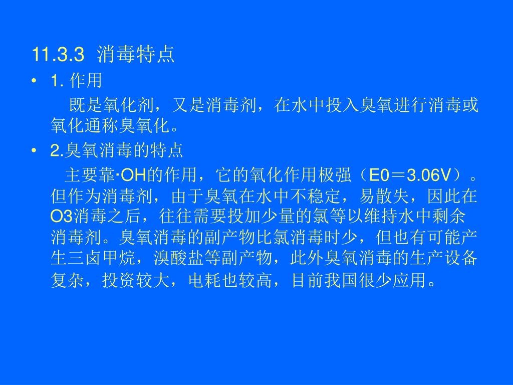 11.3.3 消毒特点 • 1. 作用 既是氧化剂,又是消毒剂,在水中投入臭氧进行消毒或氧化通称臭氧化。 • 2.臭氧消毒的特点 主要靠·OH的作用,它的氧化作用极强(E0=3.06V)。但作为消毒剂,由于臭氧在水中不稳定,易散失,因此在O3消毒之后,往往需要投加少量的氯等以维持水中剩余消毒剂。臭氧消毒的副产物比氯消毒时少,但也有可能产生三卤甲烷,溴酸盐等副产物,此外臭氧消毒的生产设备复杂,投资较大,电耗也较高,目前我国很少应用。