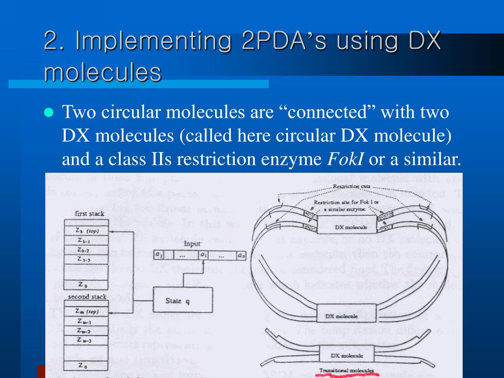 2. Implementing 2PDA’s using DX molecules • Two circular molecules are “connected” with two DX molecules (called here circular DX molecule) and a class IIs restriction enzyme FokI or a similar.