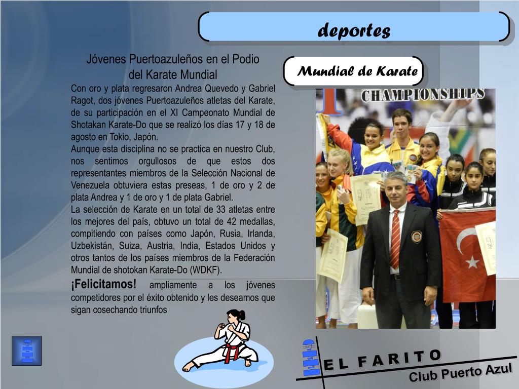 deportes Jóvenes Puertoazuleños en el Podio del Karate Mundial Con oro y plata regresaron Andrea Quevedo y Gabriel Ragot, dos jóvenes Puertoazuleños atletas del Karate, de su participación en el XI Campeonato Mundial de Shotakan Karate-Do que se realizó los días 17 y 18 de agosto en Tokio, Japón. Aunque esta disciplina no se practica en nuestro Club, nos sentimos orgullosos de que estos dos representantes miembros de la Selección Nacional de Venezuela obtuviera estas preseas, 1 de oro y 2 de plata Andrea y 1 de oro y 1 de plata Gabriel. La selección de Karate en un total de 33 atletas entre los mejores del país, obtuvo un total de 42 medallas, compitiendo con países como Japón, Rusia, Irlanda, Uzbekistán, Suiza, Austria, India, Estados Unidos y otros tantos de los países miembros de la Federación Mundial de shotokan Karate-Do (WDKF). ¡Felicitamos! ampliamente a los jóvenes competidores por el éxito obtenido y les deseamos que sigan cosechando triunfos Mundial de Karate