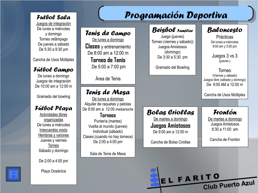 Programación Deportiva Futbol Sala Juegos de integración De lunes a miércoles y domingo Torneo relâmpago De jueves a sábado De 5:30 a 9:30 pm Cancha de Usos Múltiples Fútbol Campo De lunes a domingo Juegos de integración De 10:00 am a 12:00 m Gramado del bowling Fútbol Playa Actividades libres organizadas De lunes a miércoles Intercambio mixto Hembras y varones Jueves y viernes Torneo Sábado y domingo De 2:00 a 4:00 pm PlayaOceánica Beisbol Familiar Juego (jueves) Torneo (viernes y sábado)) Juegos Amistosos (domingo) De 3:30 a 5:30 pm Gramado del Bowling Baloncesto Prácticas De lunes a miércoles 9:00 am y 3:00 pm Juegos 3 vs 3 (jueves ) Torneo (Viernes y sábado) Juegos libre (sábado y domingo) De 9:00 AM a 12:00 m Cancha de Usos Múltiples Tenis de Campo De lunes a domingo Clases y entrenamiento De 8:00 am a 12:00 m Torneo de Tenis De 5:00 a 7:00 pm Área de Tenis Tenis de Mesa De lunes a domingo Alquiler de raquetas y pelotas De 9:00 am a 12:00 medianoche Torneos Puntería (martes) Vuelta al mundo (jueves) Individual (sábado) Clases (cuando no hay torneos) De 2:00 a 4:00 pm Sala de Tenis de Mesa Bolas Criollas De martes a domingo Juegos Amistosos De 9:00 am a 12:00 m Cancha de Bolas Criollas Frontón De martes a domingo Juegos Amistosos 8:30 a 11:00 am Cancha de Frontón