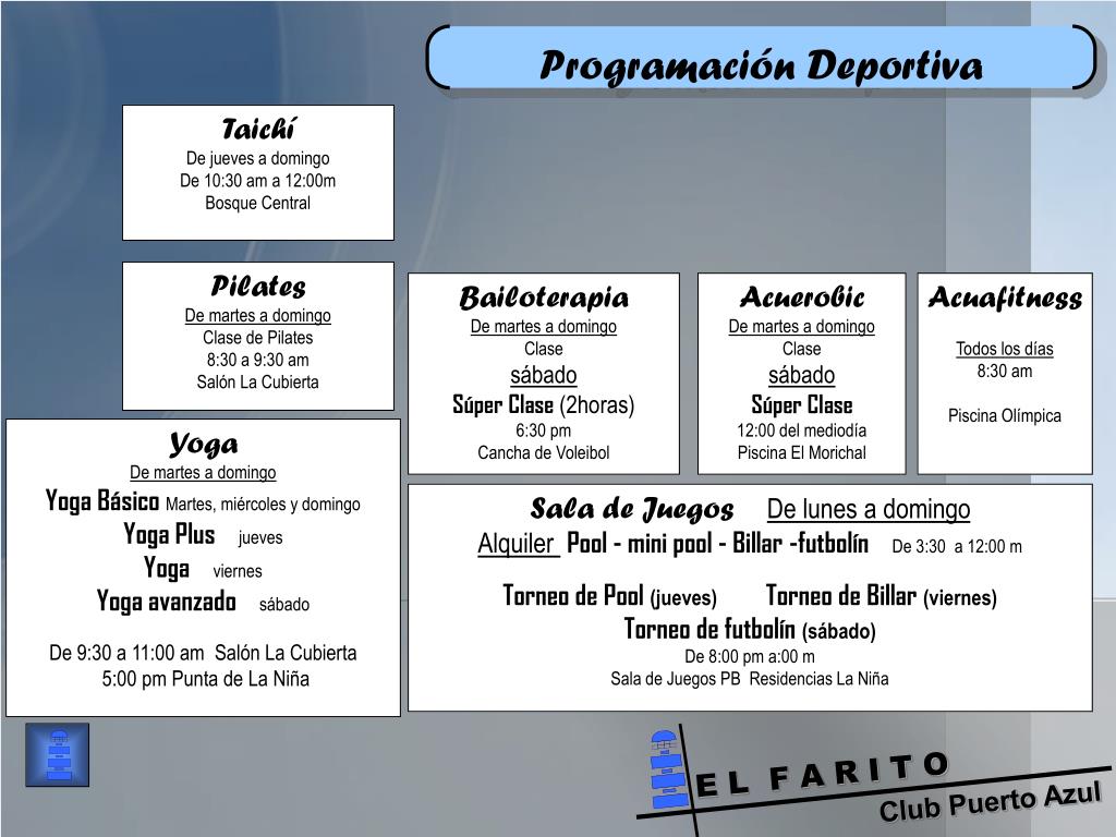 Programación Deportiva Taichí De jueves a domingo De 10:30 am a 12:00m Bosque Central Pilates De martes a domingo Clase de Pilates 8:30 a 9:30 am Salón La Cubierta Bailoterapia De martes a domingo Clase sábado Súper Clase (2horas) 6:30 pm Cancha de Voleibol Acuerobic De martes a domingo Clase sábado Súper Clase 12:00 del mediodía Piscina El Morichal Acuafitness Todos los días 8:30 am Piscina Olímpica Yoga De martes a domingo Yoga Básico Martes, miércoles y domingo Yoga Plus jueves Yoga viernes Yoga avanzado sábado De 9:30 a 11:00 am Salón La Cubierta 5:00 pm Punta de La Niña Sala de Juegos De lunes a domingo Alquiler Pool - mini pool - Billar -futbolín De 3:30 a 12:00 m Torneo de Pool (jueves) Torneo de Billar (viernes) Torneo de futbolín (sábado) De 8:00 pm a:00 m Sala de Juegos PB Residencias La Niña