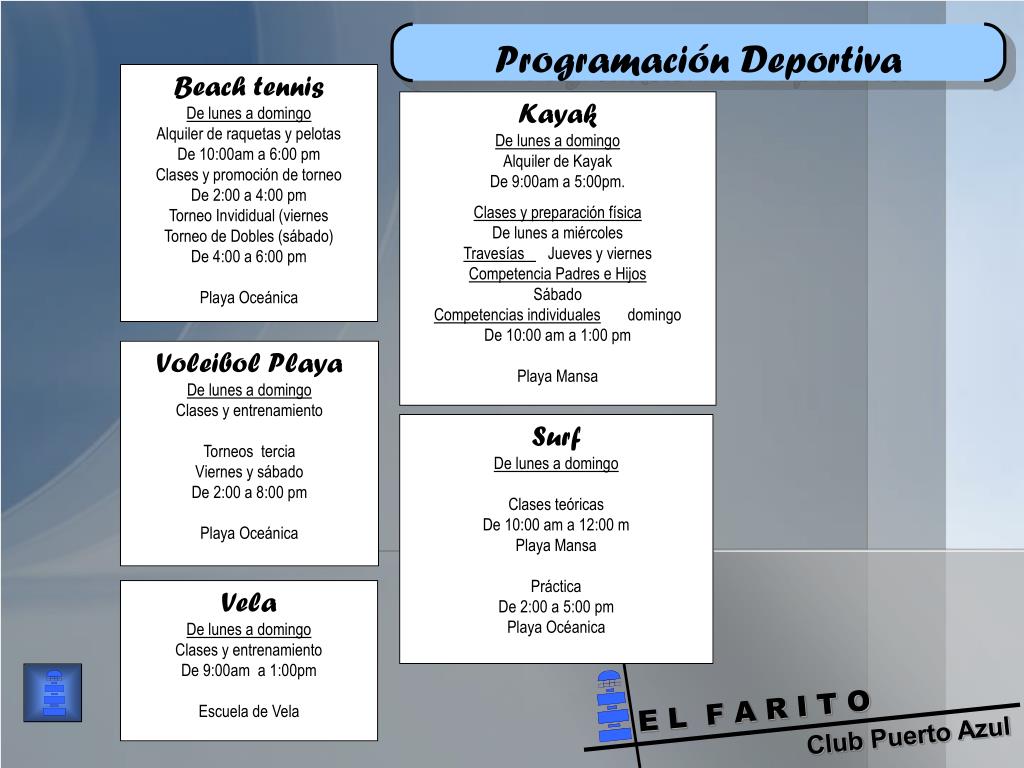 Programación Deportiva Beach tennis De lunes a domingo Alquiler de raquetas y pelotas De 10:00am a 6:00 pm Clases y promoción de torneo De 2:00 a 4:00 pm Torneo Invididual (viernes Torneo de Dobles (sábado) De 4:00 a 6:00 pm Playa Oceánica Kayak De lunes a domingo Alquiler de Kayak De 9:00am a 5:00pm. Clases y preparación física De lunes a miércoles Travesías Jueves y viernes Competencia Padres e Hijos Sábado Competencias individuales domingo De 10:00 am a 1:00 pm Playa Mansa Voleibol Playa De lunes a domingo Clases y entrenamiento Torneos tercia Viernes y sábado De 2:00 a 8:00 pm Playa Oceánica Surf De lunes a domingo Clases teóricas De 10:00 am a 12:00 m Playa Mansa Práctica De 2:00 a 5:00 pm Playa Océanica Vela De lunes a domingo Clases y entrenamiento De 9:00am a 1:00pm Escuela de Vela