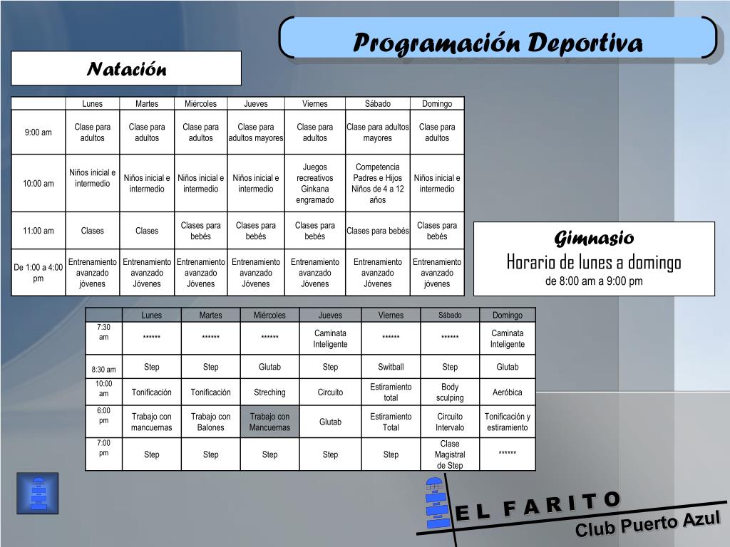 Programación Deportiva Gimnasio Horario de lunes a domingo de 8:00 am a 9:00 pm