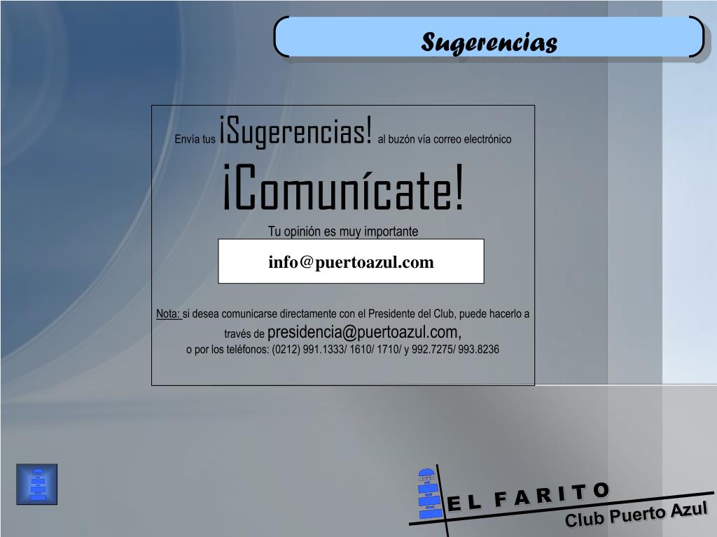 Sugerencias Envía tus ¡Sugerencias!al buzón vía correo electrónico ¡Comunícate! Tu opinión es muy importante Nota: si desea comunicarse directamente con el Presidente del Club, puede hacerlo a través de presidencia@puertoazul.com, o por los teléfonos: (0212) 991.1333/ 1610/ 1710/ y 992.7275/ 993.8236 info@puertoazul.com