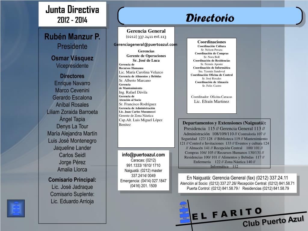 Junta Directiva 2012 - 2014 Directorio Gerencia General (0212) 337.2411 ext.113 Gerencias Gerente de Operaciones Sr. José de Luca Gerencia de Recursos Humanos Lic. María Carolina Velazco Gerencia de Alimentos y Bebidas Sr. Alberto Marcano Gerencia de Mantenimiento Ing. Rafael Dávila Gerencia de Atención al Socio Sr. Francisco Rodríguez Gerencia de Administración Lic. Juan Carlos Musumecci Gerente de Zona Náutica Cap.Alt. Luis Miguel López Benitez Rubén Manzur P. Presidente Osmar Vásquez Vicepresidente Directores Enrique Navarro Marco Cevenini Gerardo Escalona Aníbal Rosales Liliam Zoraida Barroeta Ángel Tapia Denys La Tour María Alejandra Martín Luis José Montenegro Jaqueline Lander Carlos Seidl Jorge Pérez Amalia Llorca Comisario Principal: • Lic. José Jadraque Comisario Suplente: Lic. Eduardo Arrioja Coordinaciones Coordinación Cultura Sr. Nelson Peraza Coordinación de Compras Sr. Nora Boll Coordinación de Residencias Sr. Fermín Aponte Coordinación de Informática Sra. Yasmín Sandoval Coordinación Oficina de Control Sr. José Rosales Coordinación de Almacén Sr. Felix Castro Coordinador Oficina Caracas Lic. Efraín Martinez Gerenciageneral@puertoazul.com Departamentos y Extensiones (Naiguatá): Presidencia 115 // Gerencia General 113 // Administración 108/109/110 // Contraloría 107 // Seguridad 127/ 128 // Biblioteca 119 // Mantenimiento 121 // Control e Invitaciones 133 // Eventos y cultura 124 // Almacén 141 // Recepción Central 100/ 101 // Compras 104/ 105 // Recursos Humanos 130/131 // Residencias 100/ 101 // Alimentos y Bebidas 117 // Enfermería 122 // Zona Náutica 140 // Informática 112 info@puertoazul.com Caracas: (0212) 991.1333/ 1610/ 1710 Naiguatá: (0212) master 337.2414/ 0049 Emergencia: (0414) 027.1847 (0416) 201. 1509 En Naiguatá: Gerencia General (fax) (0212) 337.24.11 Atención al Socio: (0212) 337.27.26/ Recepción Central: (0212) 841.58.71 Puerta Control: (0212) 841.58.79 / Residencias (0212) 841.58.79