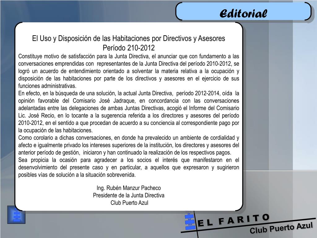 Editorial • El Uso y Disposición de las Habitaciones por Directivos y Asesores • Período 210-2012 • Constituye motivo de satisfacción para la Junta Directiva, el anunciar que con fundamento a las conversaciones emprendidas con representantes de la Junta Directiva del período 2010-2012, se logró un acuerdo de entendimiento orientado a solventar la materia relativa a la ocupación y disposición de las habitaciones por parte de los directivos y asesores en el ejercicio de sus funciones administrativas. • En efecto, en la búsqueda de una solución, la actual Junta Directiva, período 2012-2014, oída la opinión favorable del Comisario José Jadraque, en concordancia con las conversaciones adelantadas entre las delegaciones de ambas Juntas Directivas, acogió el Informe del Comisario Lic. José Recio, en lo tocante a la sugerencia referida a los directores y asesores del período 2010-2012, en el sentido a que procedan de acuerdo a su conciencia al correspondiente pago por la ocupación de las habitaciones. • Como corolario a dichas conversaciones, en donde ha prevalecido un ambiente de cordialidad y afecto e igualmente privado los intereses superiores de la institución, los directores y asesores del anterior período de gestión, iniciaron y han continuado la realización de los respectivos pagos. • Sea propicia la ocasión para agradecer a los socios el interés que manifestaron en el desenvolvimiento del presente caso y en particular, a aquellos que expresaron y sugirieron posibles vías de solución a la situación sobrevenida. • Ing. Rubén Manzur Pacheco • Presidente de la Junta Directiva • Club Puerto Azul