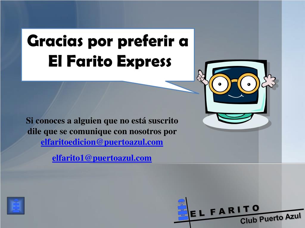 Gracias por preferir a El Farito Express Si conoces a alguien que no está suscrito dile que se comunique con nosotros por elfaritoedicion@puertoazul.com elfarito1@puertoazul.com