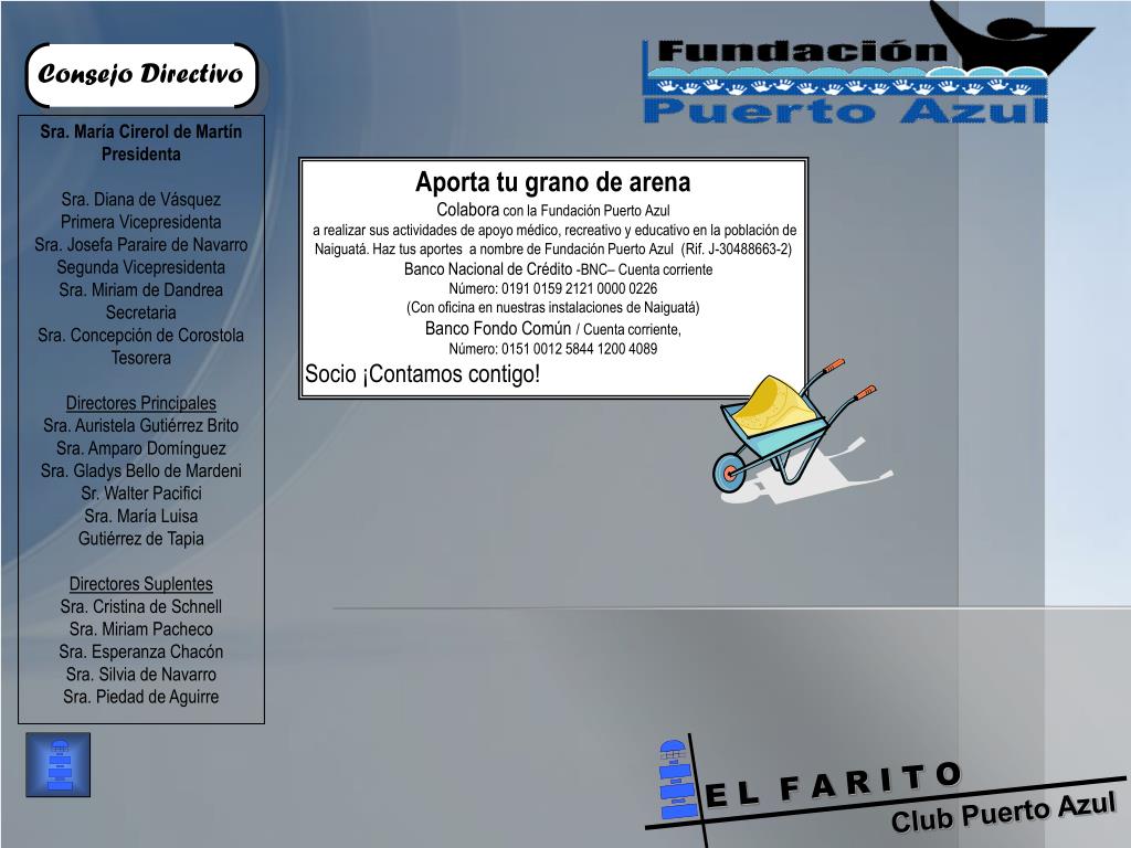 Consejo Directivo Sra. María Cirerol de Martín Presidenta Sra. Diana de Vásquez Primera VicepresidentaSra. Josefa Paraire de Navarro Segunda VicepresidentaSra. Miriam de Dandrea SecretariaSra. Concepción de Corostola Tesorera Directores PrincipalesSra. Auristela Gutiérrez BritoSra. Amparo DomínguezSra. Gladys Bello de MardeniSr. Walter PacificiSra. María Luisa Gutiérrez de Tapia Directores SuplentesSra. Cristina de SchnellSra. Miriam PachecoSra. Esperanza ChacónSra. Silvia de NavarroSra. Piedad de Aguirre Aporta tu grano de arena Colabora con la Fundación Puerto Azul a realizar sus actividades de apoyo médico, recreativo y educativo en la población de Naiguatá. Haz tus aportes a nombre de Fundación Puerto Azul (Rif. J-30488663-2) Banco Nacional de Crédito -BNC– Cuenta corriente Número: 0191 0159 2121 0000 0226 (Con oficina en nuestras instalaciones de Naiguatá) Banco Fondo Común / Cuenta corriente, Número: 0151 0012 5844 1200 4089 Socio ¡Contamos contigo!