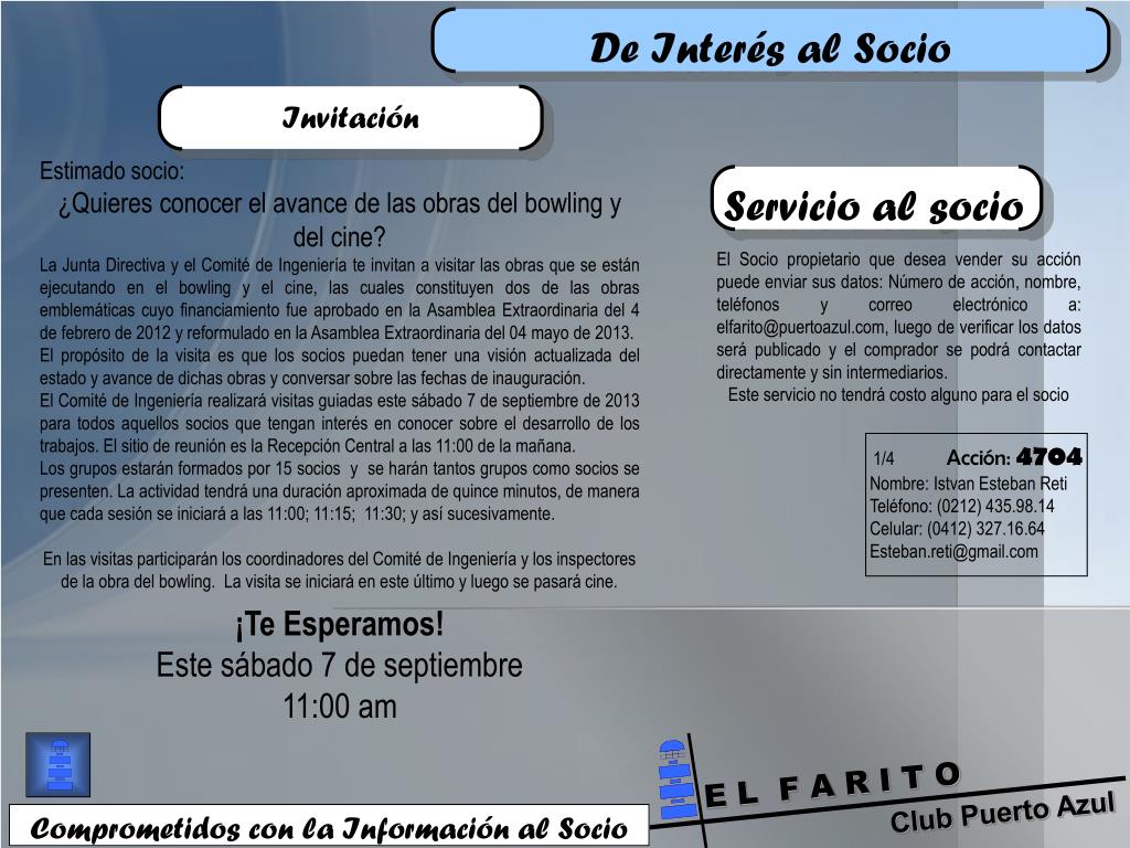 De Interés al Socio Invitación Estimado socio: ¿Quieres conocer el avance de las obras del bowling y del cine? La Junta Directiva y el Comité de Ingeniería te invitan a visitar las obras que se están ejecutando en el bowling y el cine, las cuales constituyen dos de las obras emblemáticas cuyo financiamiento fue aprobado en la Asamblea Extraordinaria del 4 de febrero de 2012 y reformulado en la Asamblea Extraordinaria del 04 mayo de 2013. El propósito de la visita es que los socios puedan tener una visión actualizada del estado y avance de dichas obras y conversar sobre las fechas de inauguración. El Comité de Ingeniería realizará visitas guiadas este sábado 7 de septiembre de 2013 para todos aquellos socios que tengan interés en conocer sobre el desarrollo de los trabajos. El sitio de reunión es la Recepción Central a las 11:00 de la mañana. Los grupos estarán formados por 15 socios y se harán tantos grupos como socios se presenten. La actividad tendrá una duración aproximada de quince minutos, de manera que cada sesión se iniciará a las 11:00; 11:15; 11:30; y así sucesivamente. En las visitas participarán los coordinadores del Comité de Ingeniería y los inspectores de la obra del bowling. La visita se iniciará en este último y luego se pasará cine. ¡Te Esperamos! Este sábado 7 de septiembre 11:00 am Servicio al socio El Socio propietario que desea vender su acción puede enviar sus datos: Número de acción, nombre, teléfonos y correo electrónico a: elfarito@puertoazul.com, luego de verificar los datos será publicado y el comprador se podrá contactar directamente y sin intermediarios. Este servicio no tendrá costo alguno para el socio 1/4 Acción: 4704 Nombre: Istvan Esteban Reti Teléfono: (0212) 435.98.14 Celular: (0412) 327.16.64 Esteban.reti@gmail.com Comprometidos con la Información al Socio
