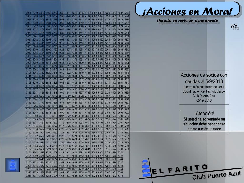 ¡Acciones en Mora! Listado en revisión permanente • 2/2 Acciones de socios con deudas al 5/9/2013 Información suministrada por la Coordinación de Tecnología del Club Puerto Azul 05/ 9/ 2013 ¡Atención! Si usted ha solventado su situación debe hacer caso omiso a este llamado