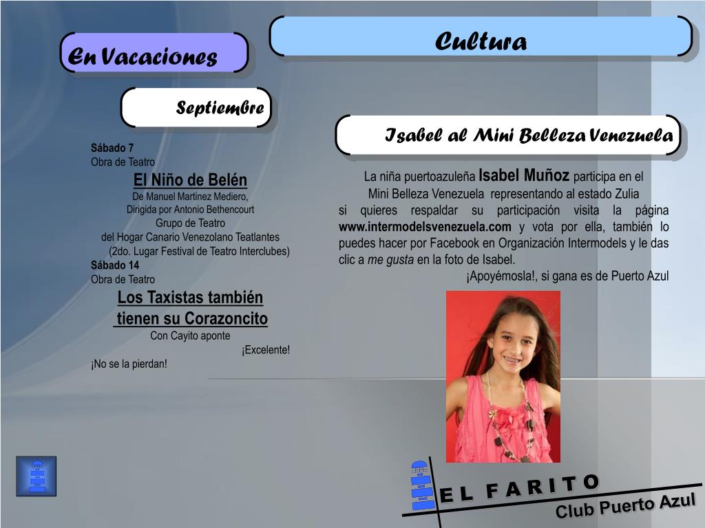 Cultura En Vacaciones Septiembre Isabel al Mini Belleza Venezuela Sábado 7 Obra de Teatro El Niño de Belén De Manuel Martinez Mediero, Dirigida por Antonio Bethencourt Grupo de Teatro del Hogar Canario Venezolano Teatlantes (2do. Lugar Festival de Teatro Interclubes) Sábado 14 Obra de Teatro Los Taxistas también tienen su Corazoncito Con Cayito aponte ¡Excelente! ¡No se la pierdan! La niña puertoazuleñaIsabel Muñoz participa en el Mini Belleza Venezuela representando al estado Zulia si quieres respaldar su participación visita la página www.intermodelsvenezuela.com y vota por ella, también lo puedes hacer por Facebook en Organización Intermodels y le das clic a me gusta en la foto de Isabel. ¡Apoyémosla!, si gana es de Puerto Azul